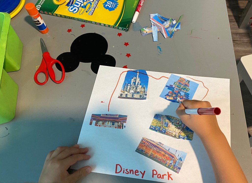 -Disney map making: First I printed out 5 pictures of rides from Disney World. Then we discussed that maps are used to help people know where things are and get from place to place. I told my little he was going to design his own Disney park and make a map so people would know how to get around. He named his park and I wrote the name on the map. Then he cut out and glued each ride to a piece of paper and connected them by drawing a path between the rides.