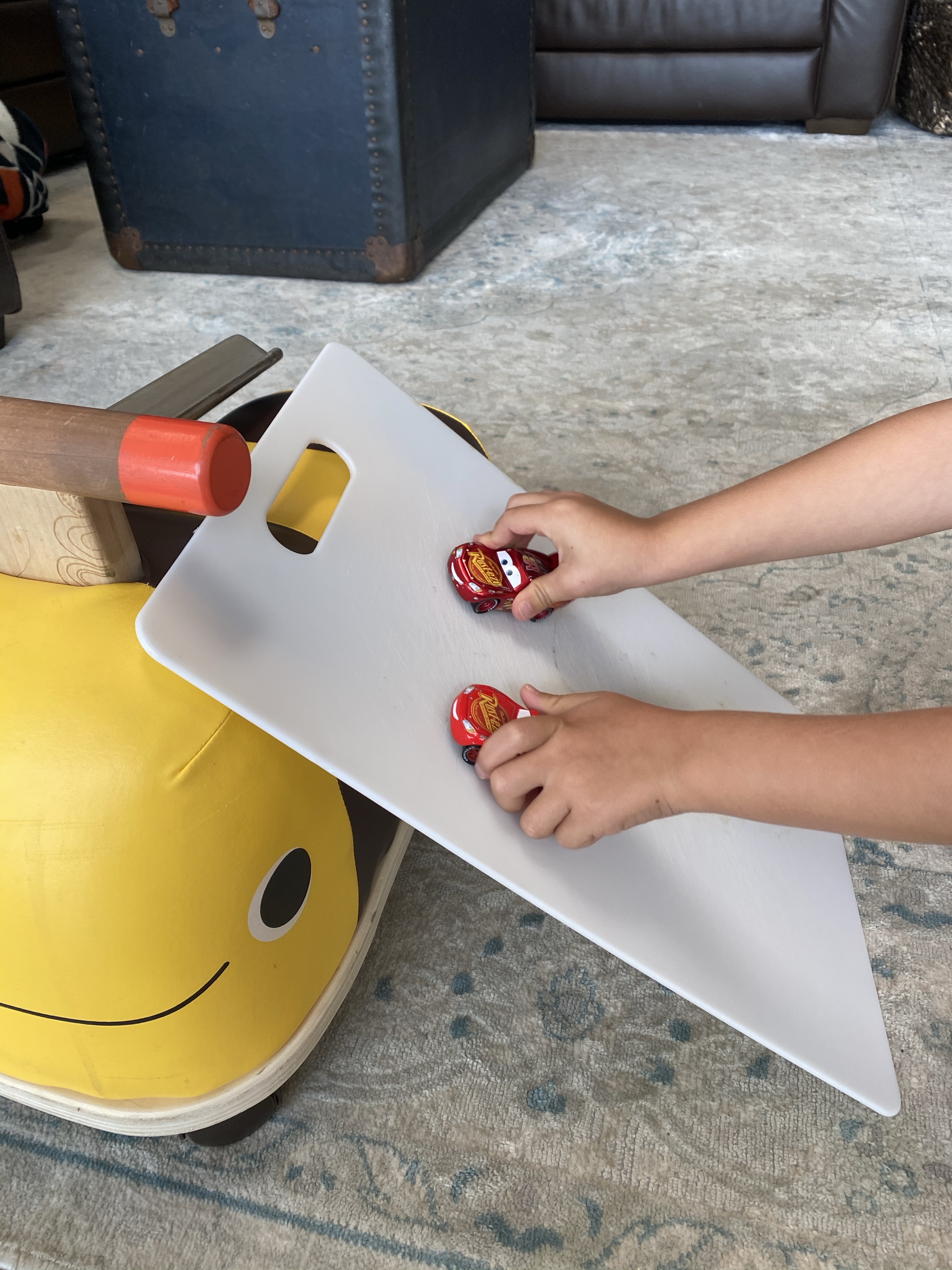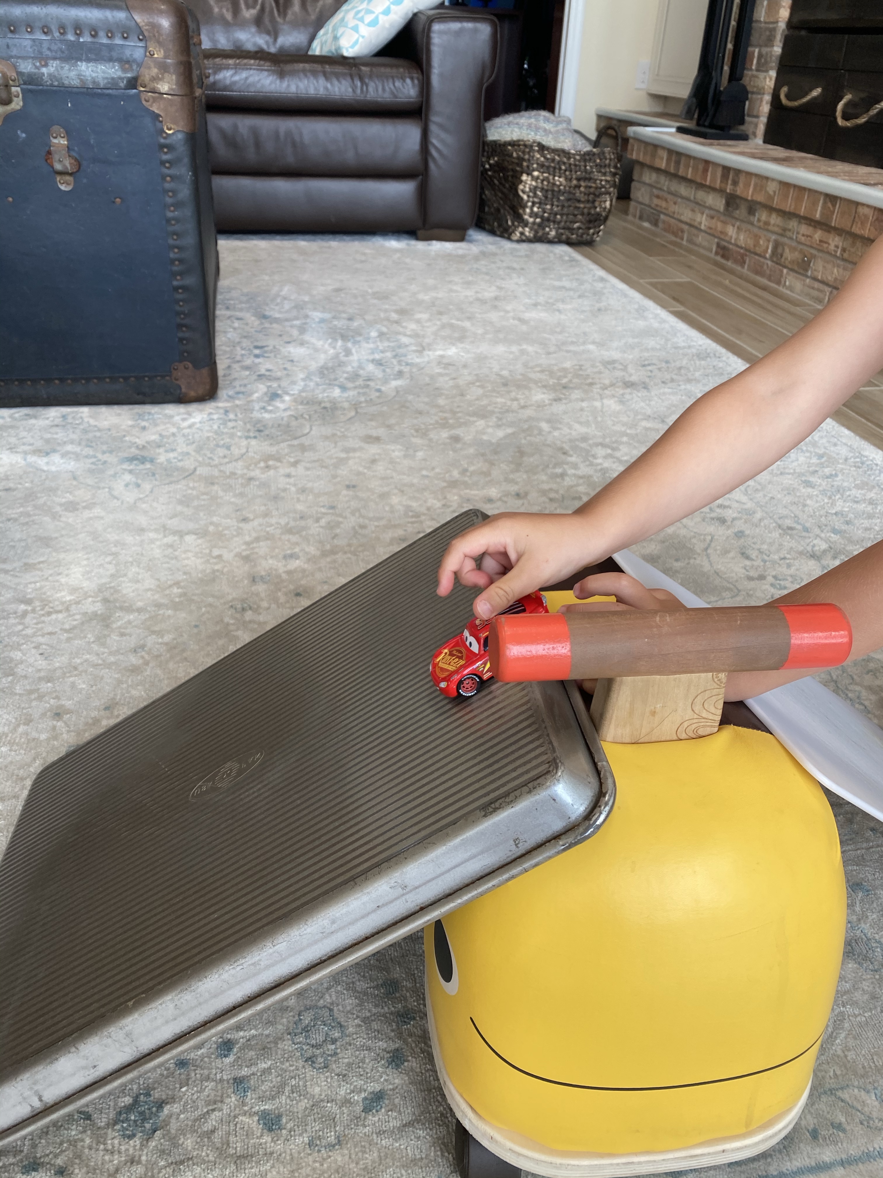 -Build Lightning McQueen’s racing ramp: We’ve done a few ramp building activities the past few months, starting with simply building a ramp using a step stool and a cookie sheet and testing different cars by putting them down the ramp and marking where they stopped with tape to see who won. Then we tested different surfaces (the tile floor, the short pile carpet and the long pile carpet) to see how friction effects how far a car can go (we put the car down the ramp and measured how far it traveled on each surface). I got both of these ideas from the PBS Kids email, which you can sign up for for free here– it’s right at the top of the page! Since my little had some ramp building experience this time I said “Ok, we’re going to build a ramp for Lightning McQueen- what do you think we should use?” and I let him engineer his own ramp! He started with a stuffed animal for the base and chose a cookie sheet for the ramp itself, but soon found out the animal was too squishy and floppy so he switched to his brother’s ride-on bumblebee! This encourages critical thinking and problem solving skills as they test and change their ramp to make it better. Once you have a good ramp- go ahead and just let them play!