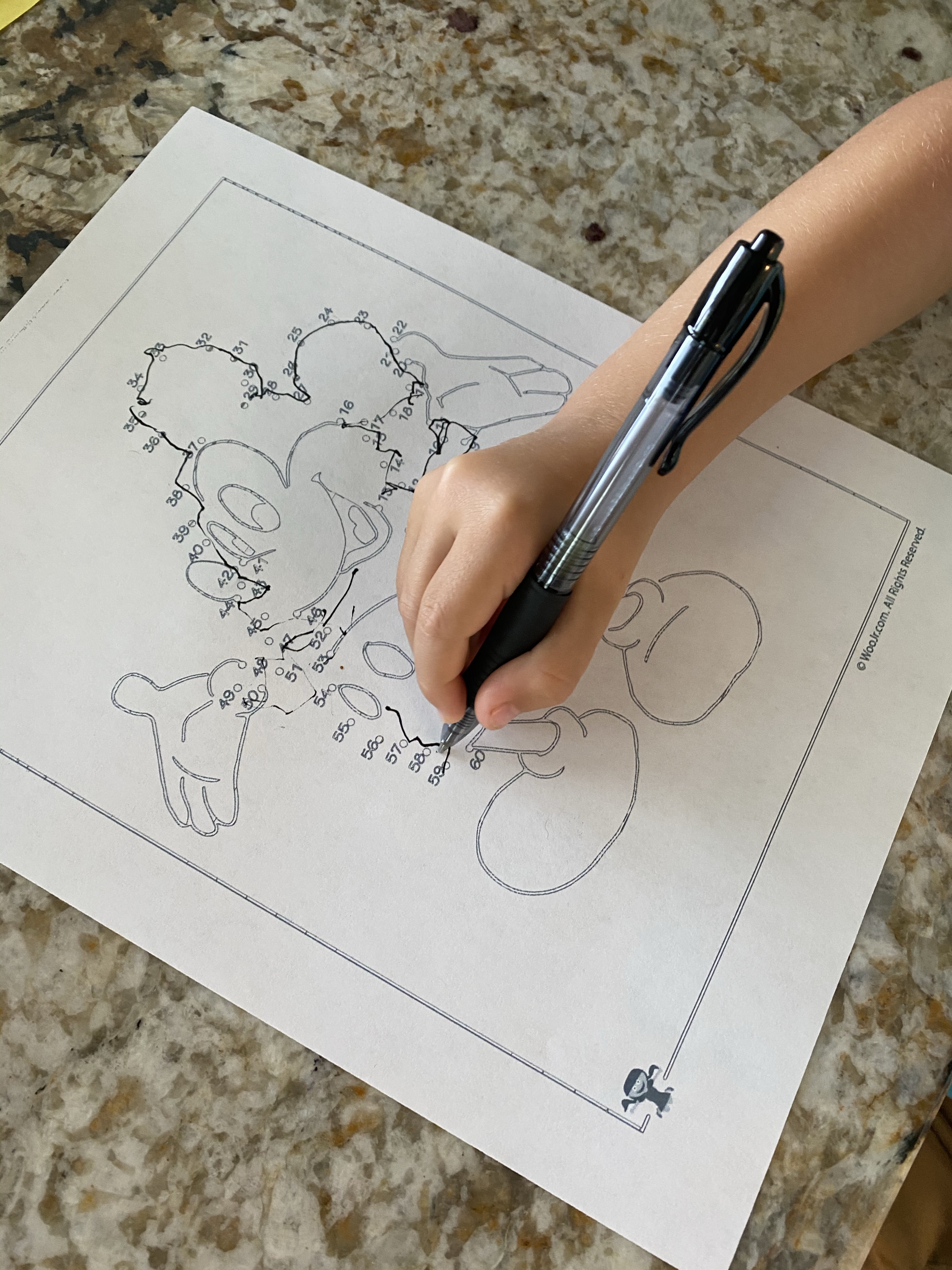 -Dot to Dot Mickey: My little loves doing connect the dots because he gets to “draw” things that may be hard for him to draw alone! I help him find the numbers while he counts and follows with his pen! I got this free printable at Woo Jr.