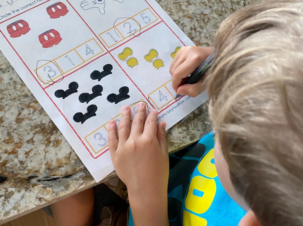 -Count and circle Mickey: I found this cute worksheet at Chart-sheet! You just have your little count up each Mickey outfit part then circle the coordinating number!