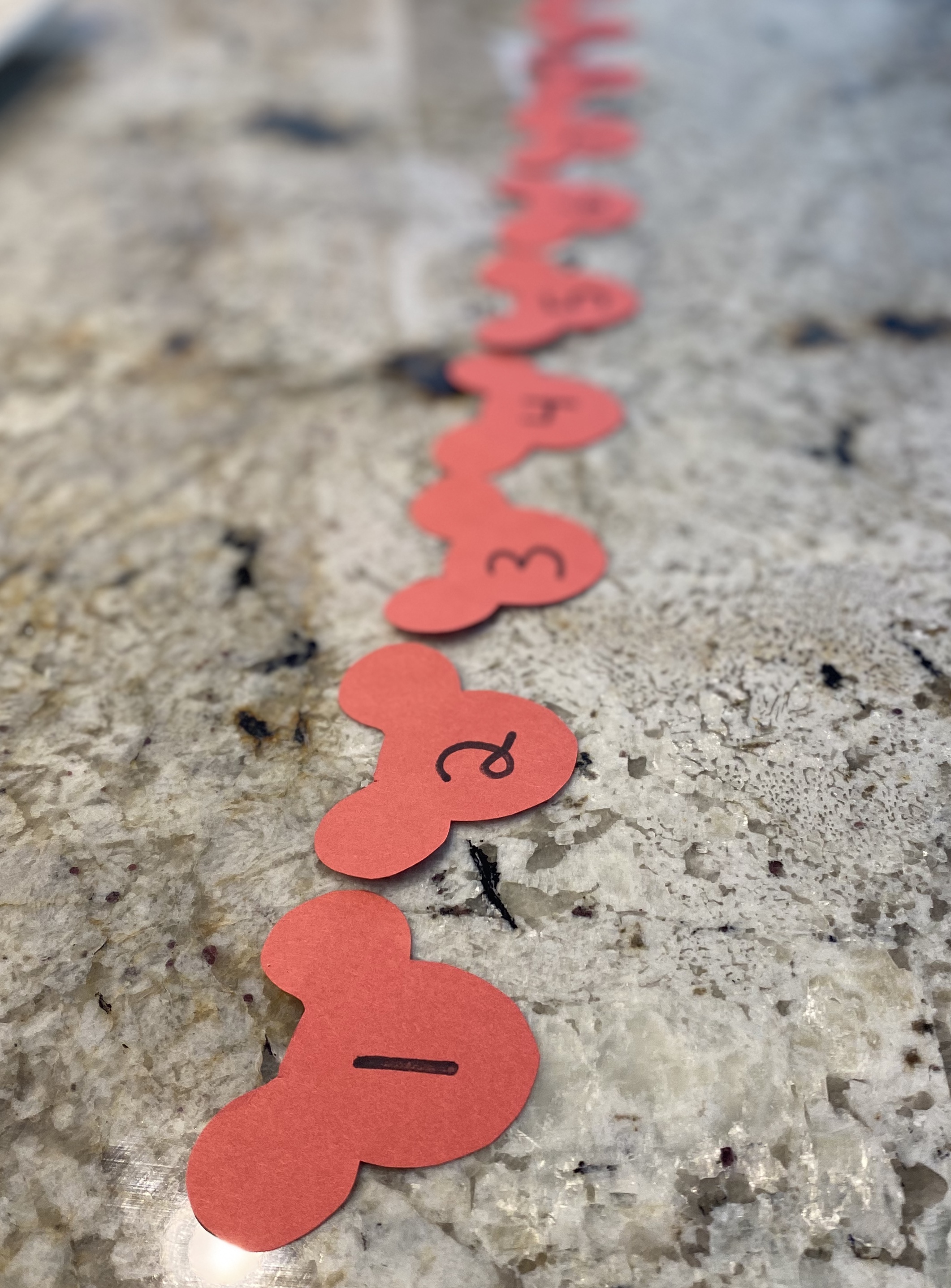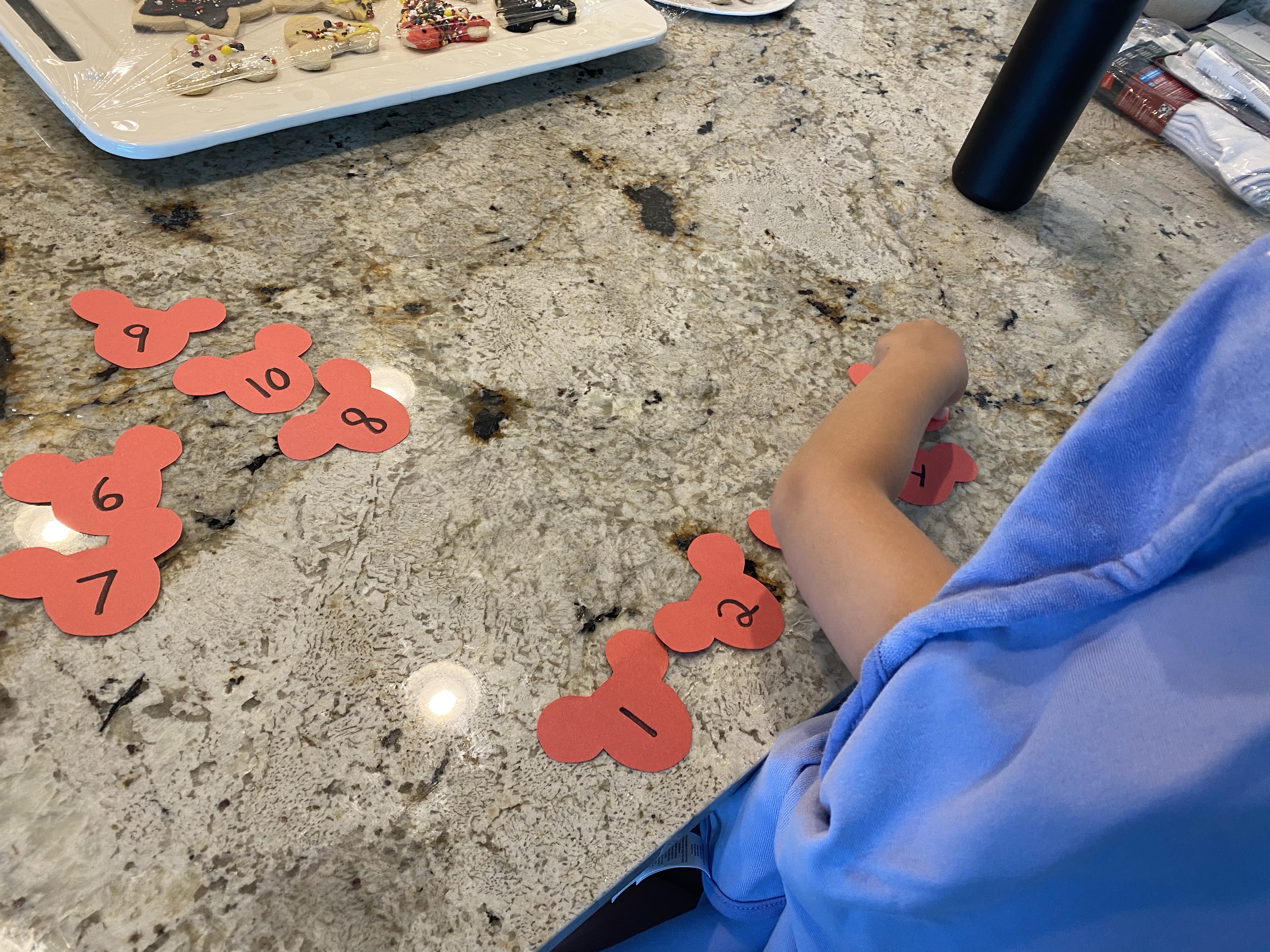 -Mickey number ordering: I traced our Mickey cookie cutter on construction paper, cut them out, then wrote the numbers 1-10 on them and had my little put them in the correct order.