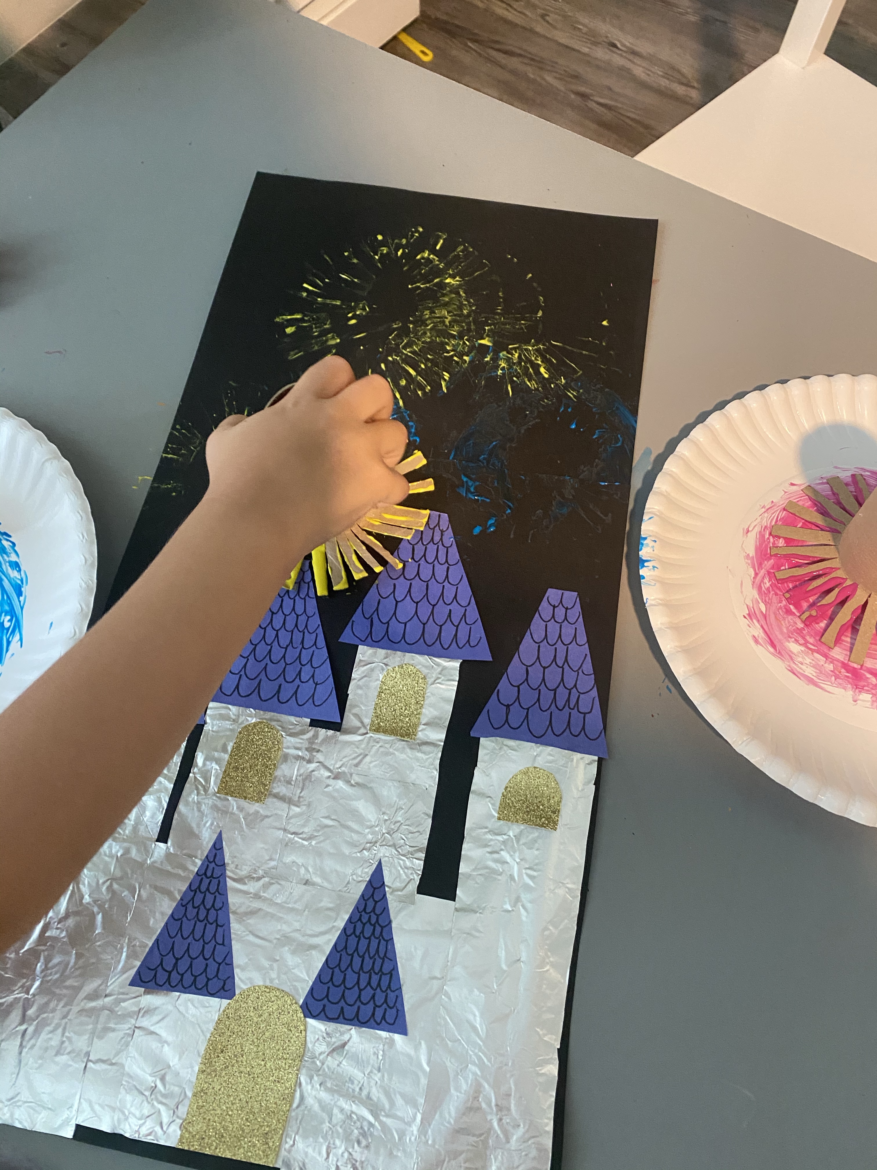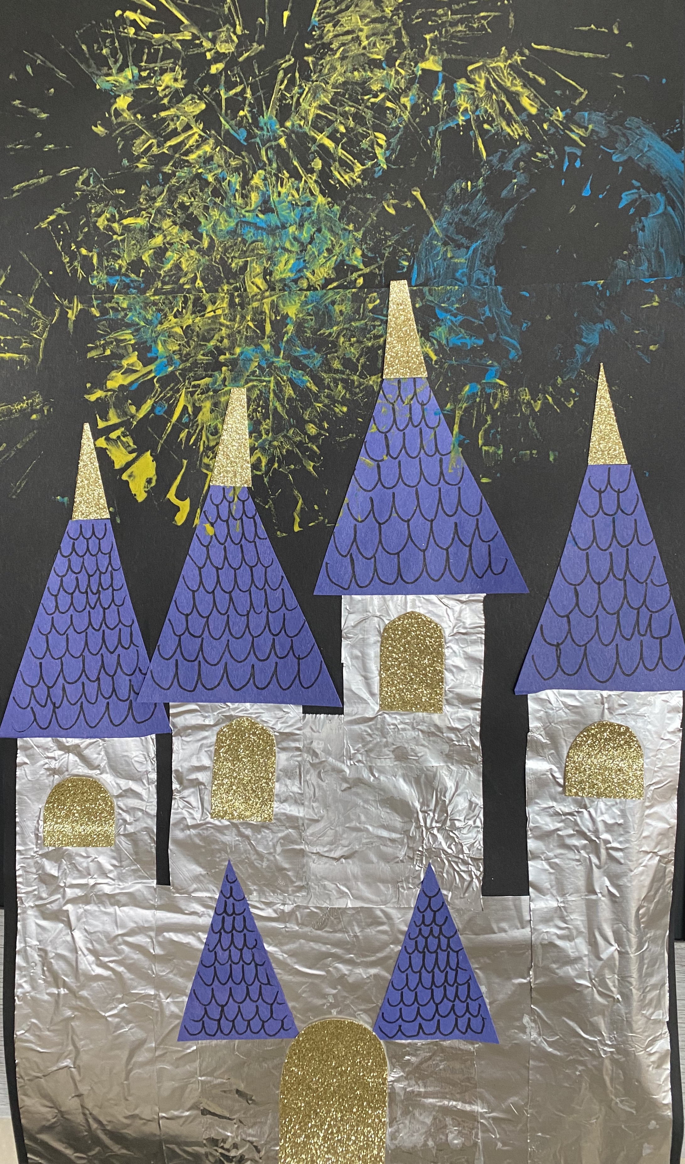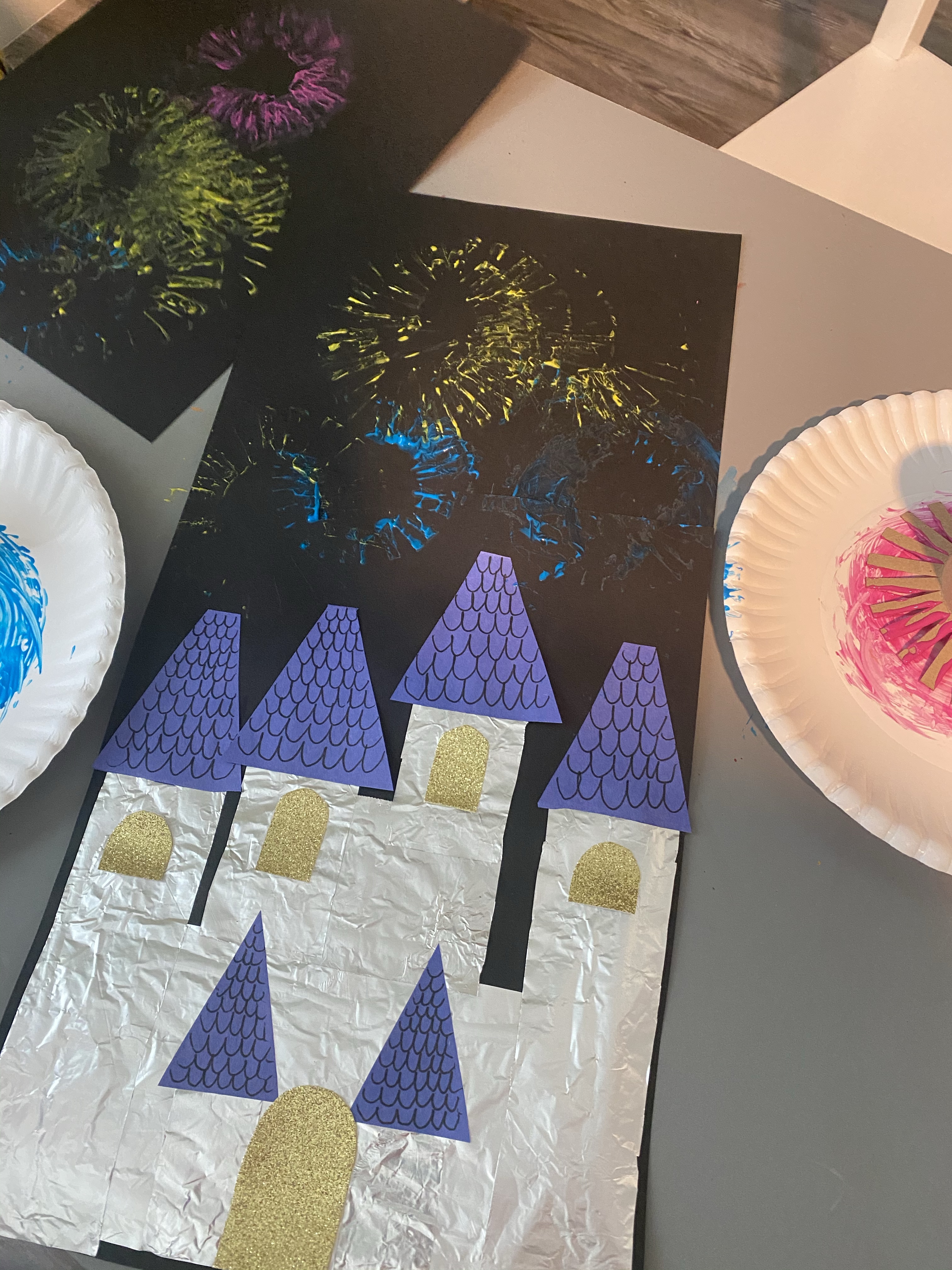 -Tin foil castle with fireworks: Make Cinderella’s castle out of tin foil (or if your child is older, they can make it themselves but it’s pretty tricky to cut and glue smoothly) on black paper. Cut some toilet paper tubes in a fringe cut around one end. Dip them in paint on paper plates and have your little use them like a stamp to make fireworks above the castle! You can also watch a beautiful prerecorded Disney fireworks show at the Disney World Blog which is a great place to get more recipe ideas and watch more magic inspiring clips- I highly recommend anything by the Dapper Dans, like this at home recording of A Dream is a Wish and also the time lapse sunrise over Cinderella’s castle! I follow them on Facebook and they never fail to add a little magic to my day!