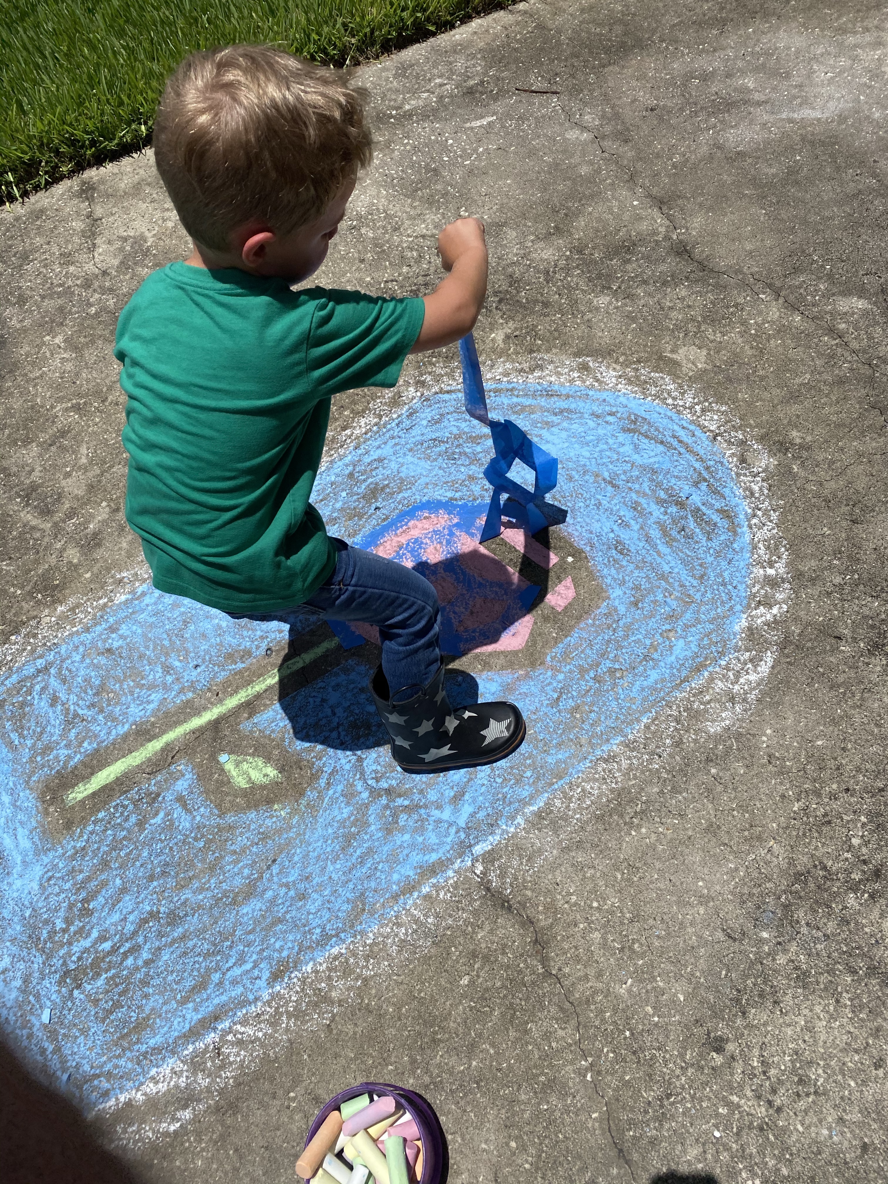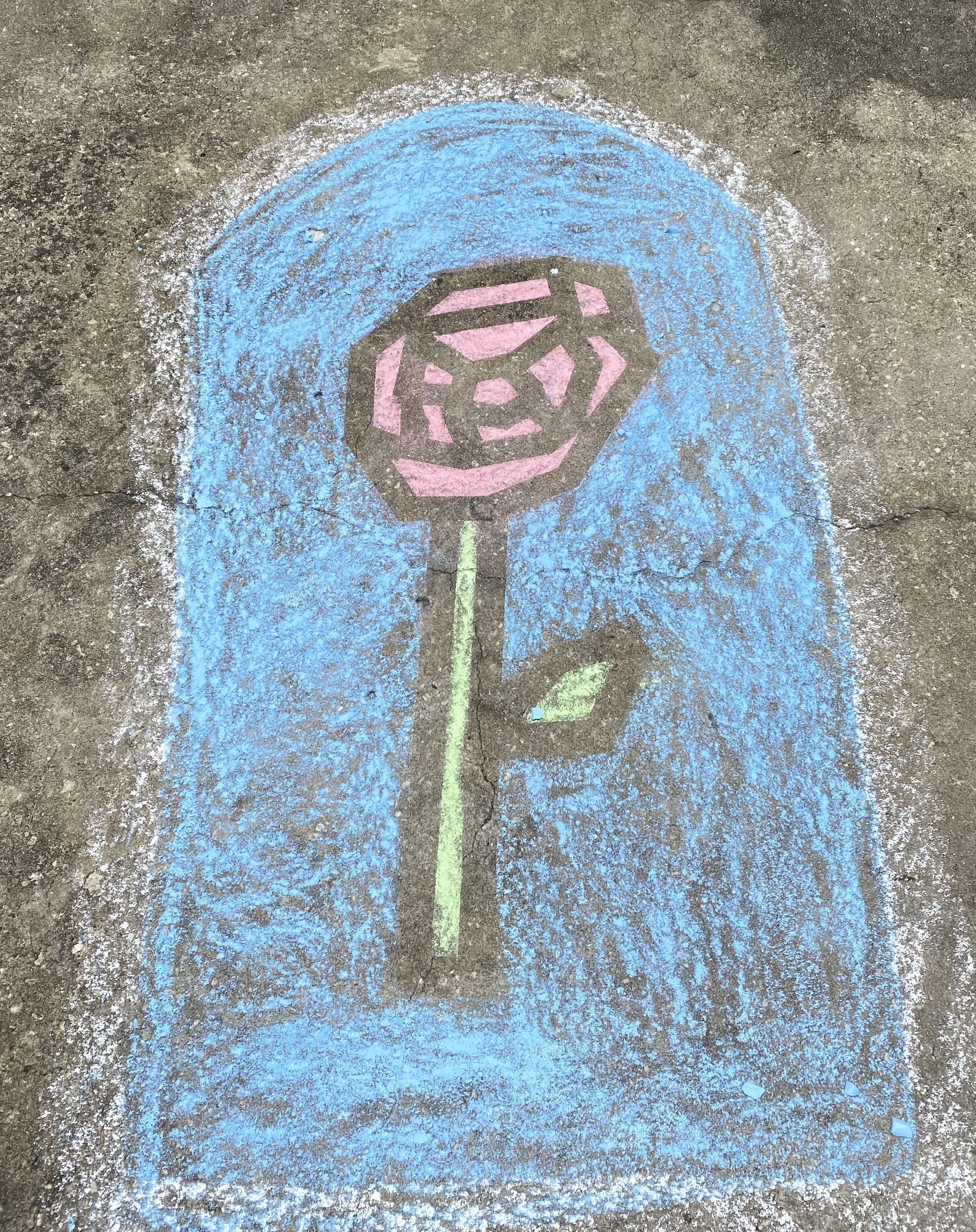 -Belle’s stained glass window: This came out so pretty! I blocked off a rose using painter’s tape on the concrete slab behind our house then had my little color it in with sidewalk chalk. He peeled the tape off to reveal a stained glass window rose! I got this idea from my friend Megan then just Disney-fied it!