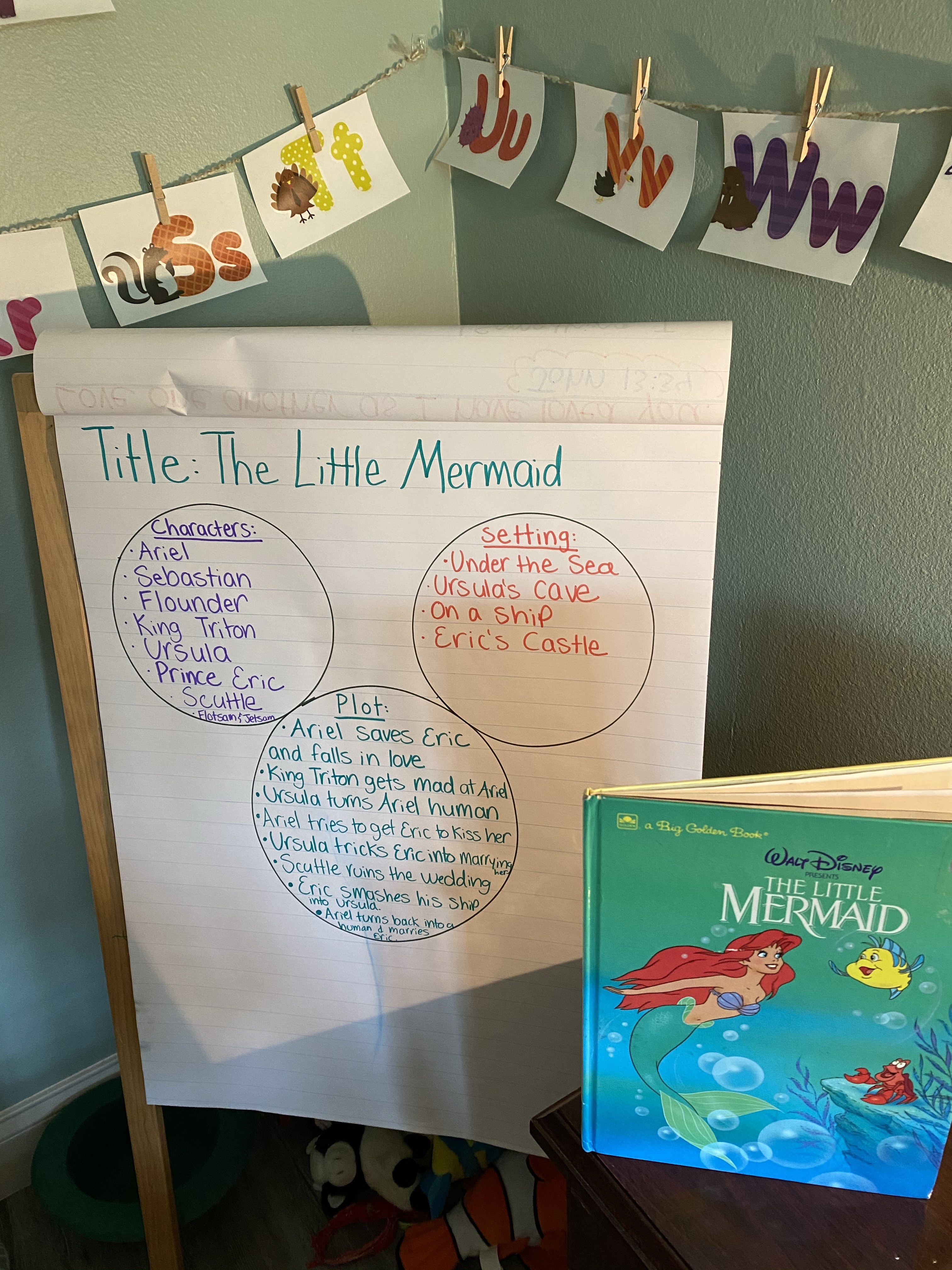 -Story elements with The Little Mermaid: We read The Little Mermaid then I had my little tell me who the characters were, where the settings were (this one was tricky- I had to explain that setting means where the story happened and reexplain that you had to think about where the characters were throughout the story), and what happened in the story. I wrote his answers on a Mickey graphic organizer I made by tracing dinner plates on chart paper!