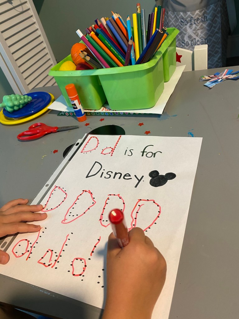 -Mickey name spelling: I traced our Mickey cookie cutter on construction paper and wrote the letters in my little’s name on each Mickey. Then I scrambled them up and had him spell his name with the letters. (We did his first and last name, but you could also do this with all of the upper and lowercase letters).