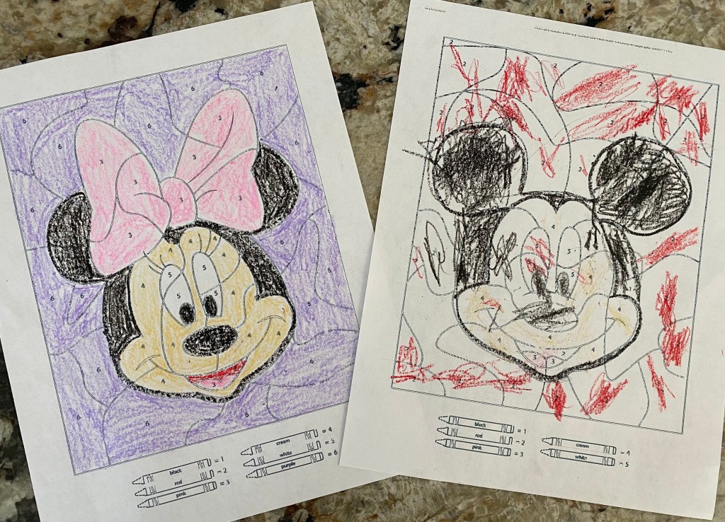 -Mickey color by number: I printed these for free from Simple Everyday Mom then my little and I reviewed numbers 1-5 by coloring each number with the matching color on the bottom of the page.
