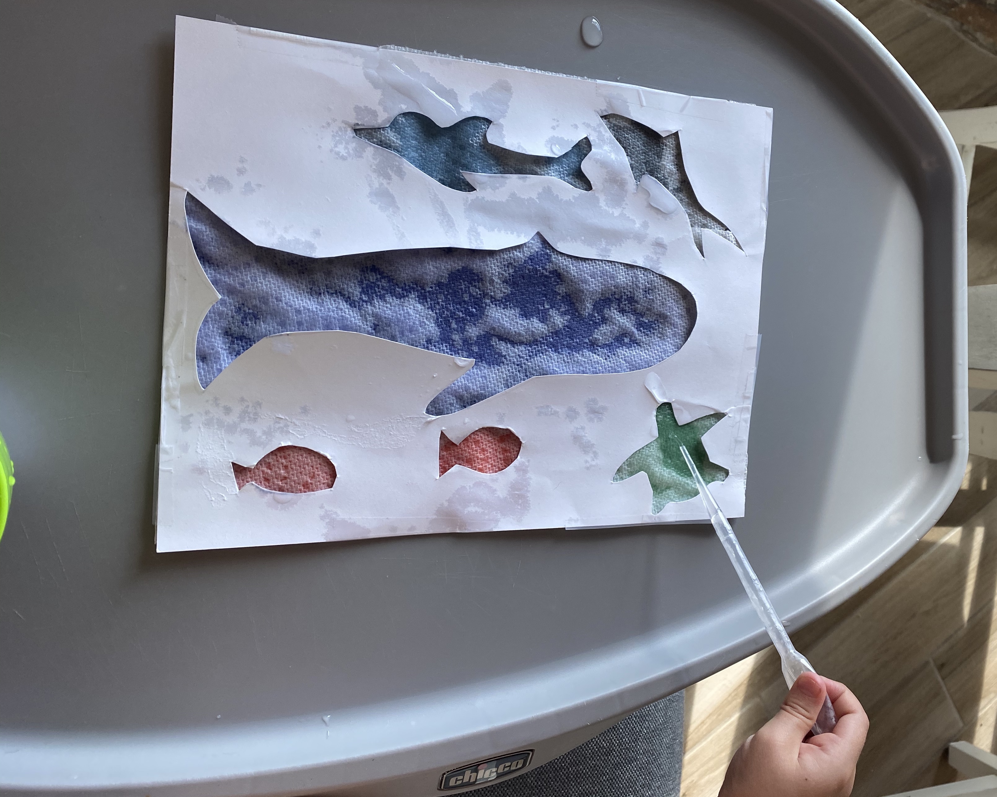 –Color reveal ocean creatures: I got this super cool idea from Muddly_Puddly Laboratory on Instagram (you have to check out her page- she has SO many creative play ideas!) It’s a bit of a bear to set up, but the result is worth it! First, cut out ocean animal shapes from cardstock. Then, tape a sheet of paper towel on the back of the cardstock. (We tried it with one sheet and two and the colors were more vibrant but slightly less hidden with one- you can see the difference in the picture below.) Then tape pieces of different colored construction paper behind each creature and have your little use a pipette to drop water on the paper towel (which starts off looking white, but “magically” changes color when wet!)