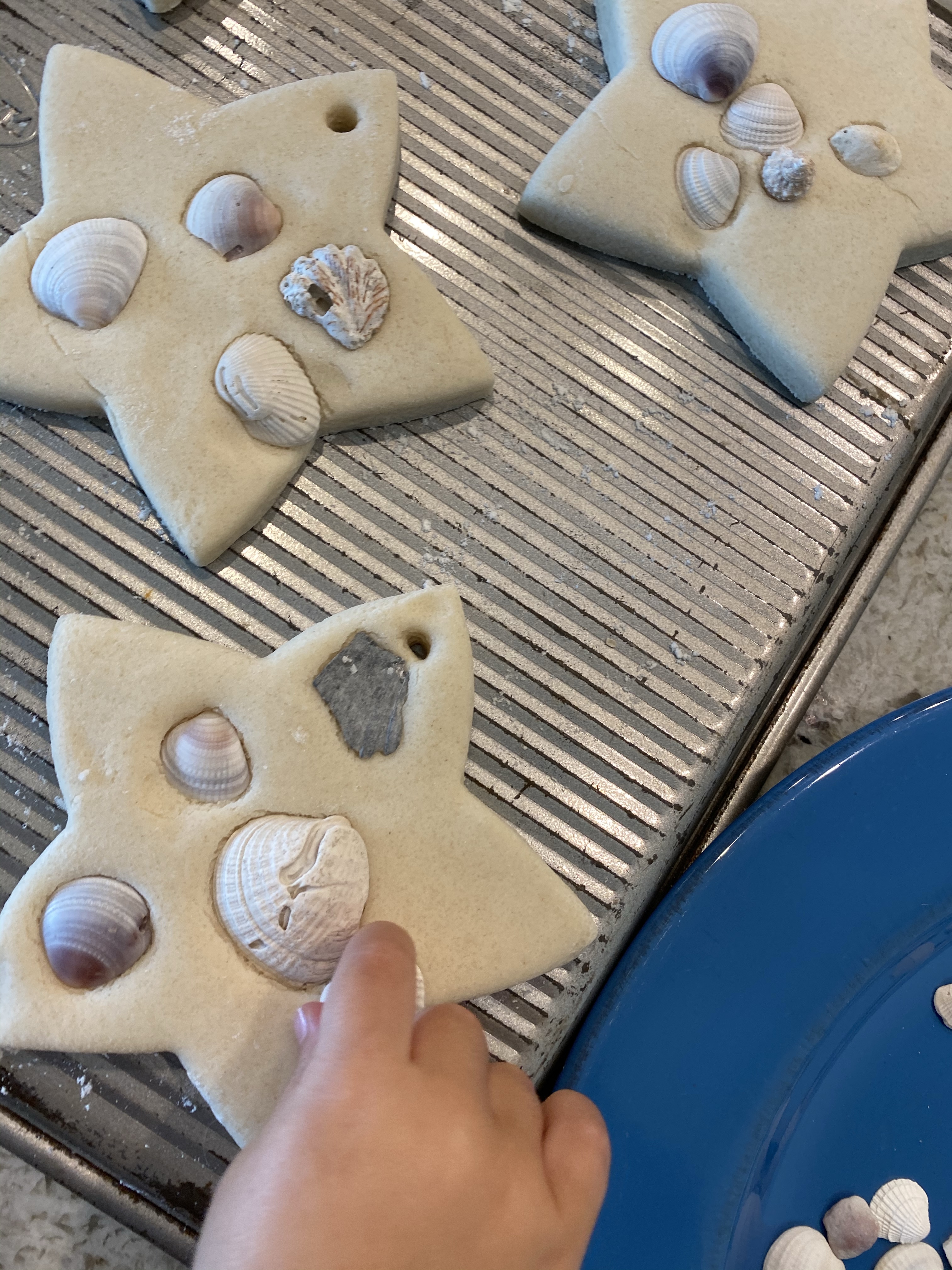 –Shell and salt dough ornaments: My friend Alysha sent me this idea and I thought it was a brilliant way to save and display all the shells your littles collect at the beach! You can follow her on Instagram at The Mommy School for more fun learning ideas. You make salt dough with 1 cup salt, 2 cups flour, and 3/4 cup water. Roll it out then cut it into shapes (we made stars because they kind of remind me of starfish!). Add a hole at the top using a straw. Let your little gently push shells into the shapes, then bake in the oven at 170-200 degrees for 45 minutes on each side. When they’re dry, you can add a coat of decoupage to seal in the shells and make them more durable, then add a hanging ribbon through the hole. They’re perfect for gifting or the Christmas tree!