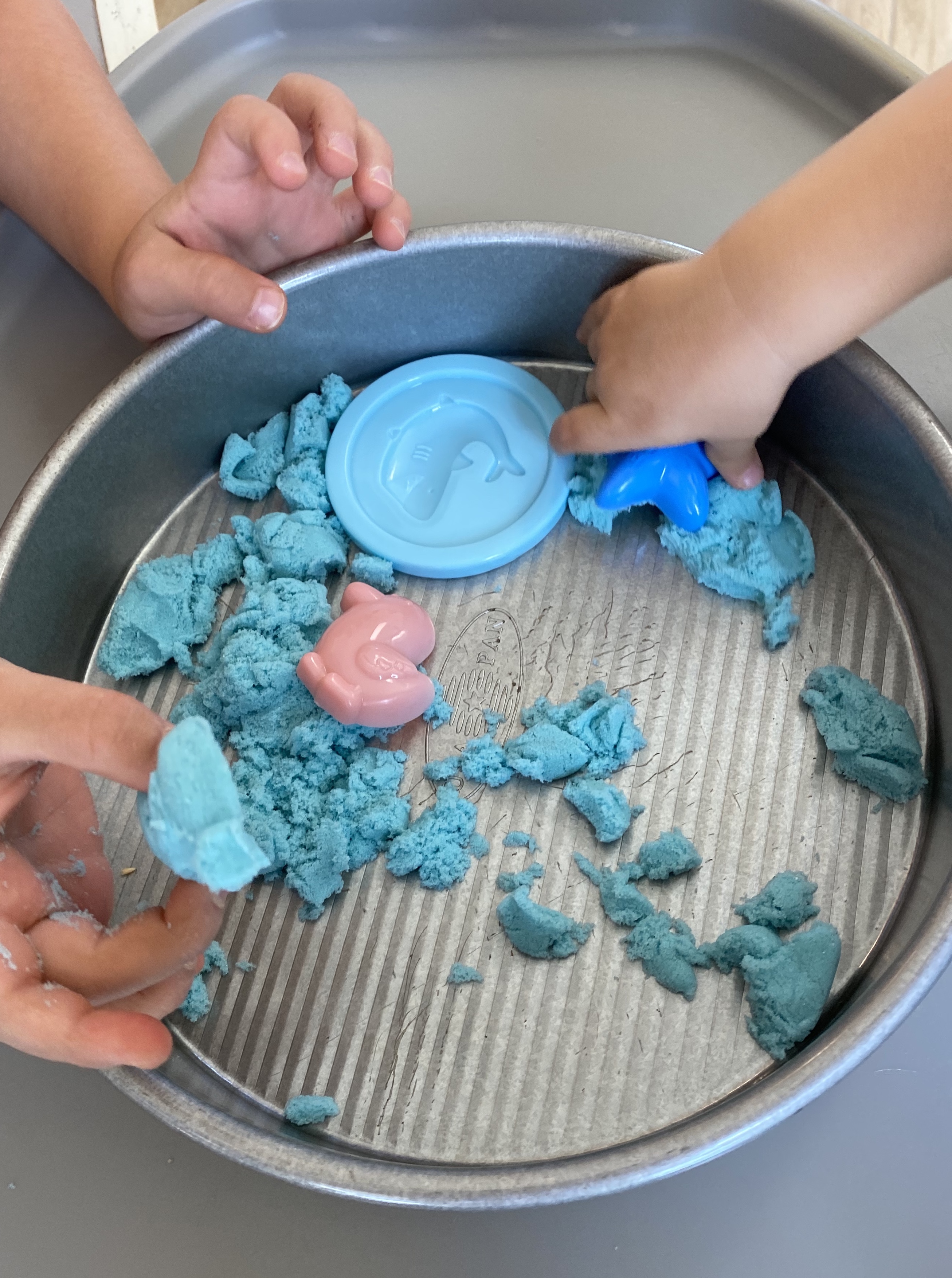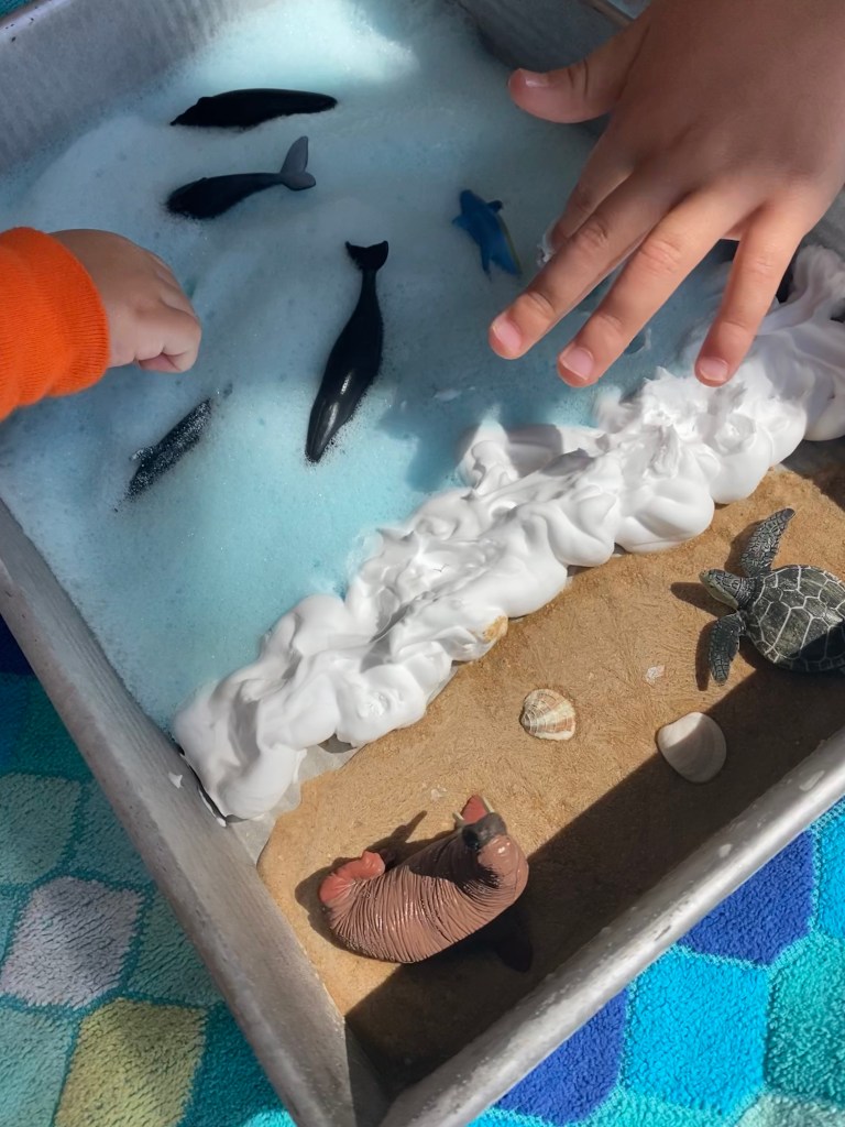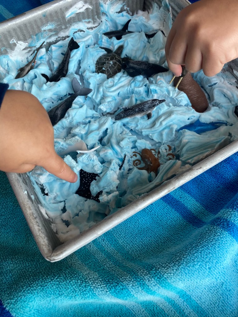 –Frozen shaving cream sea creature play: Mix some shaving cream with blue food coloring in a cake pan, place ocean animal toys in it and pop it in the freezer. After about an hour take it out and let your littles explore! You can also count the animals together to build number skills! I got the idea from Hello, Wonderful!