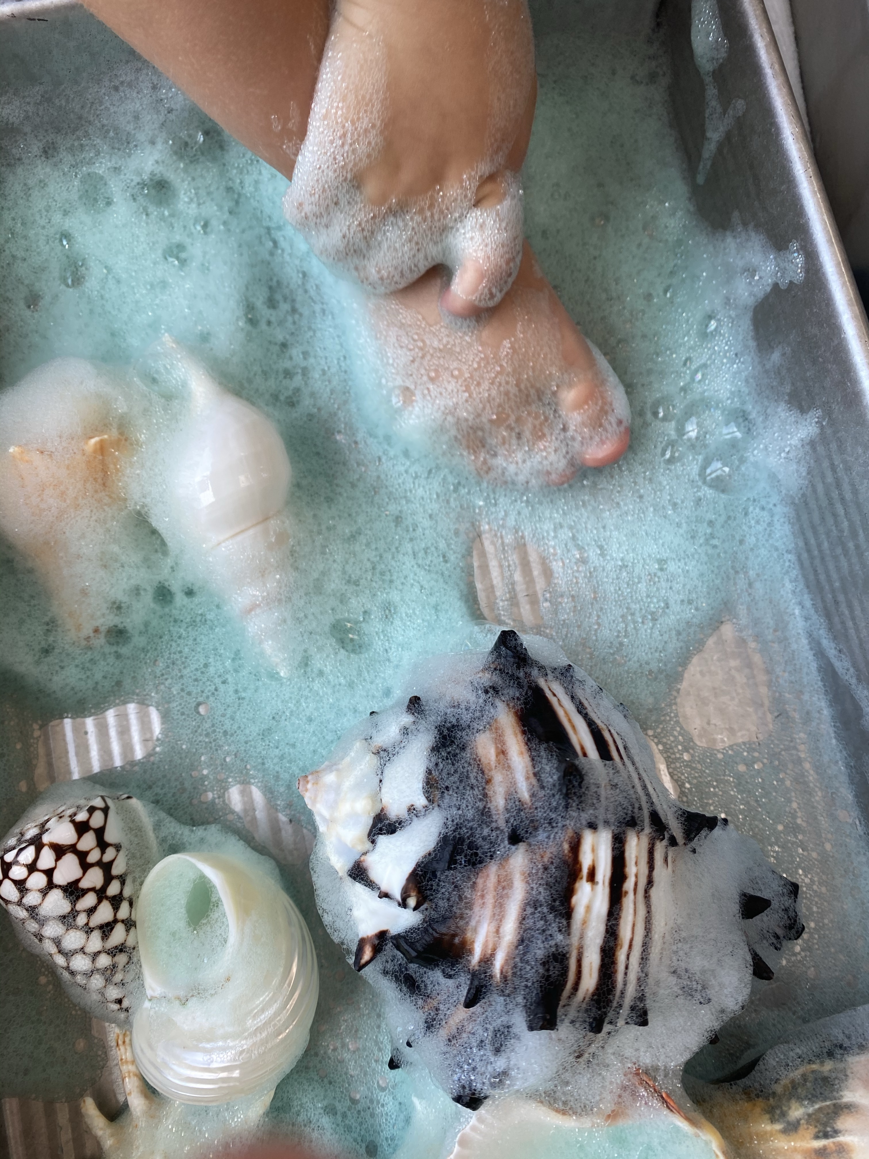 –Caribbean sea foam sensory play: We’ve done foam quite a few times and it’s always a hit with my boys! You make it by adding about 2 tablespoons of dish soap to 1/4 cup of water. Throw in 2-3 drops each of blue and green food coloring to get a nice Caribbean sea green. Beat the mixture on high until smooth foam forms. Place some shells in a cake pan, scoop the foam on top and let your little explore! (I also gave them another cake pan to put the shells in as they found them in the foam- and we counted them too once they had found them all!) I got the foam recipe from Fun at Home with Kids!