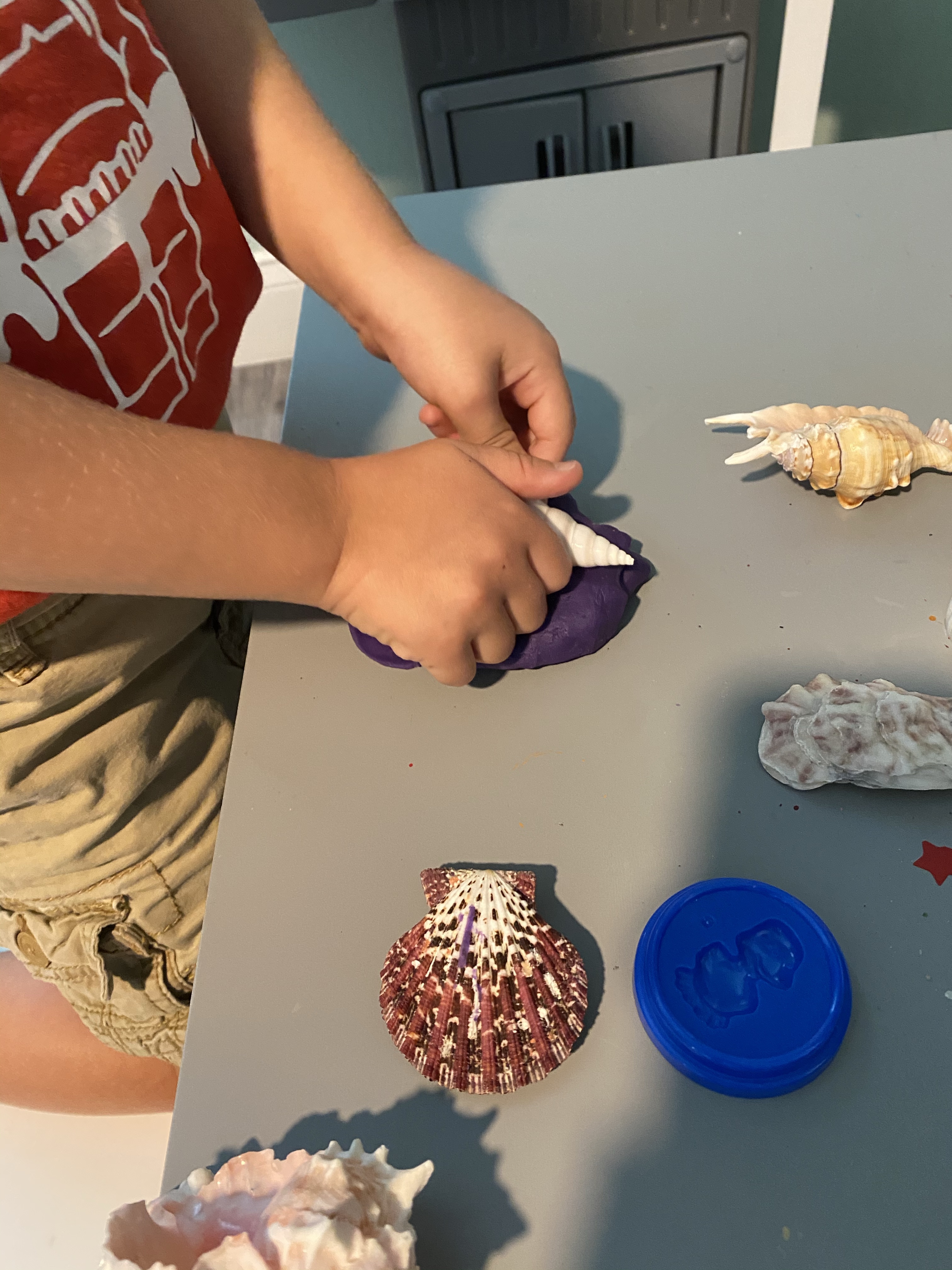–Shell printing: Give your little some playdough and various shells with different shapes and textures. Show them how to make prints in the playdough with the shells and let them explore! I got the idea from Fantastic Fun and Learning!