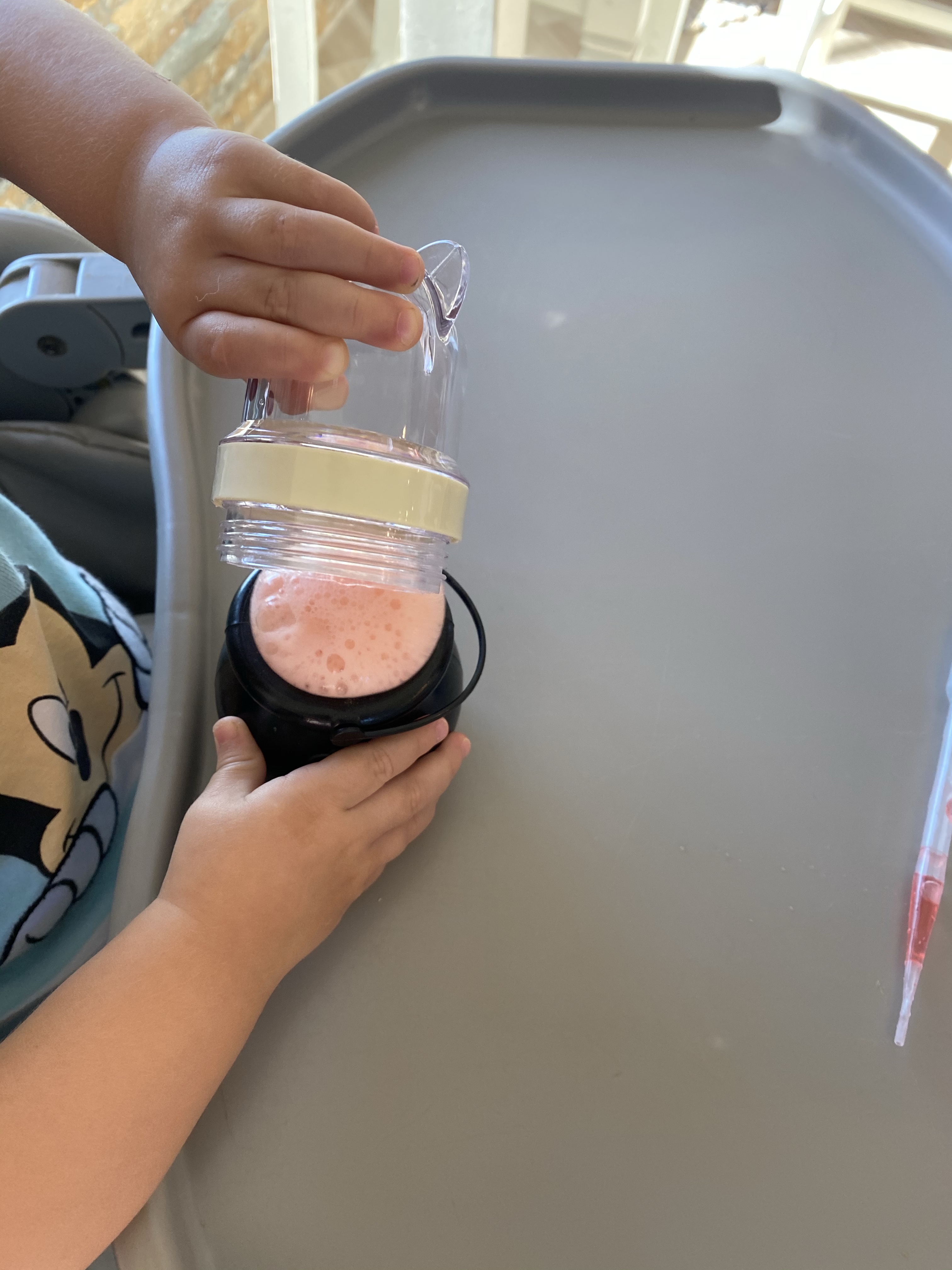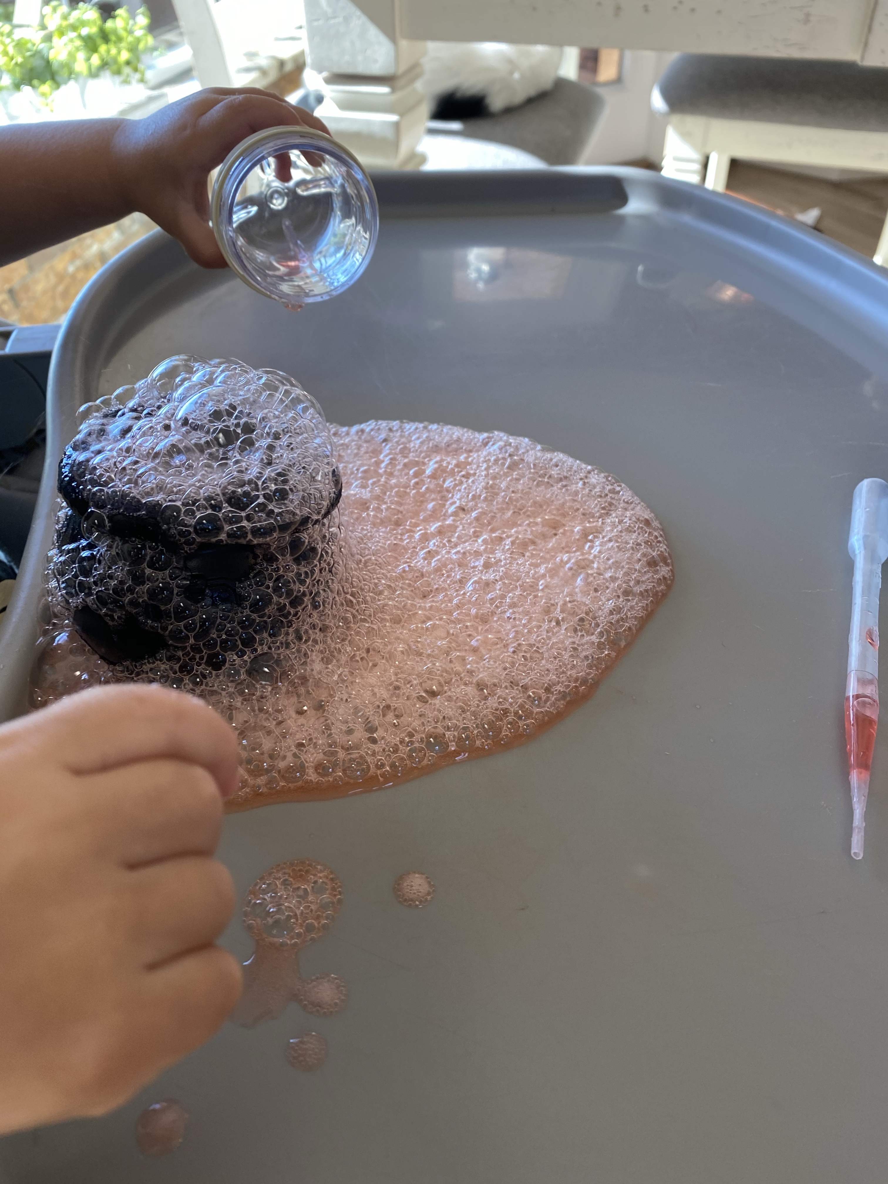 –Fairy egg fine motor practice: So originally this was supposed to be a doxy egg fine motor practice…but I didn’t actually look up the color of doxy eggs until after we did this (they’re black, not rainbow colored) and apparently they’re bean sized and poisonous (triple oops), so let’s just call them fairy eggs! In any case, my little loves this activity and it’s SO easy to set up- throw some pom poms in a whisk and show your little how to take them out using the pincer grasp- then let them try! I got this idea from Hello Wonderful!