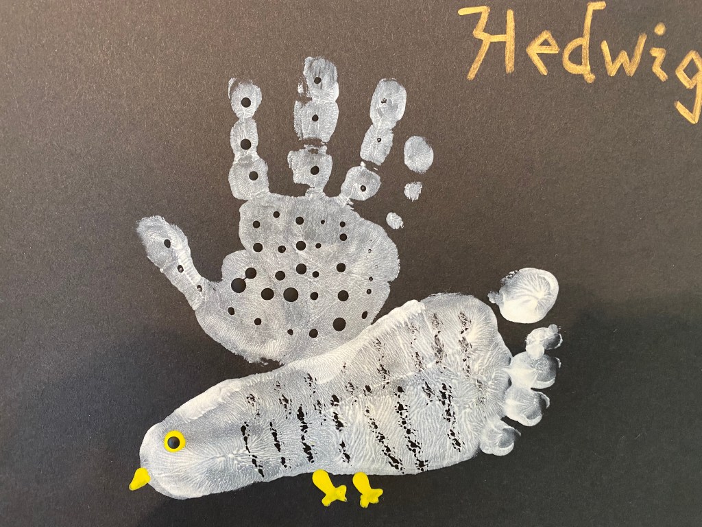 –Hedwig hand and footprint art: Make dear old Hedwig using your little’s hand and footprints!