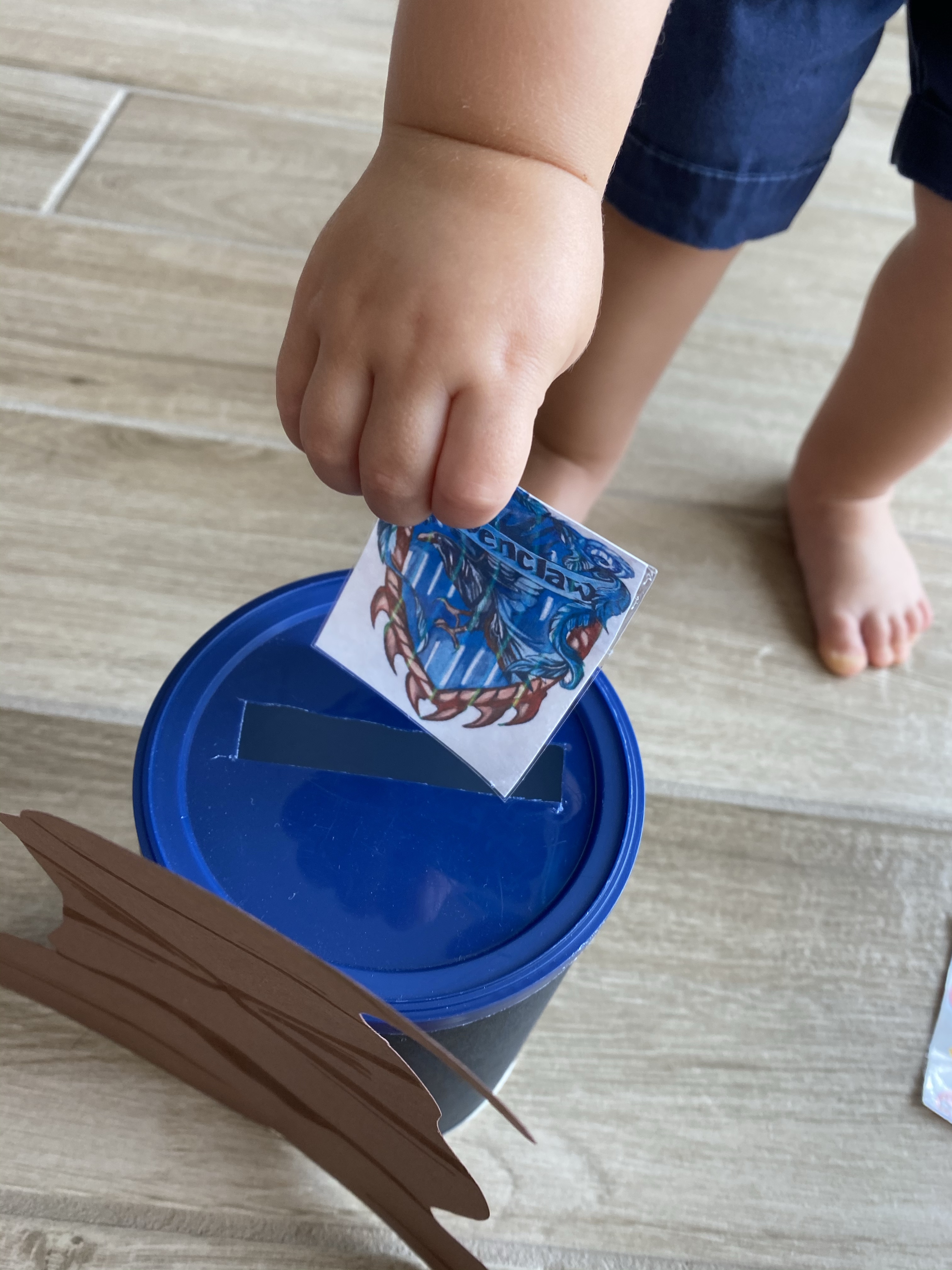 –Sorting hat play: You just can’t do a Harry Potter week without first being sorted into a house! I printed out badges from each house, cut them out, then “laminated” them to make them more sturdy by covering them in clear packing tape. Then I covered an old peanut can with black paper, cut out and hot glued on a sorting hat for the front, cut a rectangle slit in the lid and we were ready to play! First, I had my little pick a badge from the hat (with the lid off)- he got Ravenclaw! Then as he took out each badge we reviewed our colors. Next I put the lid back on and had him work on fine motor skills by putting the badges back into the can.