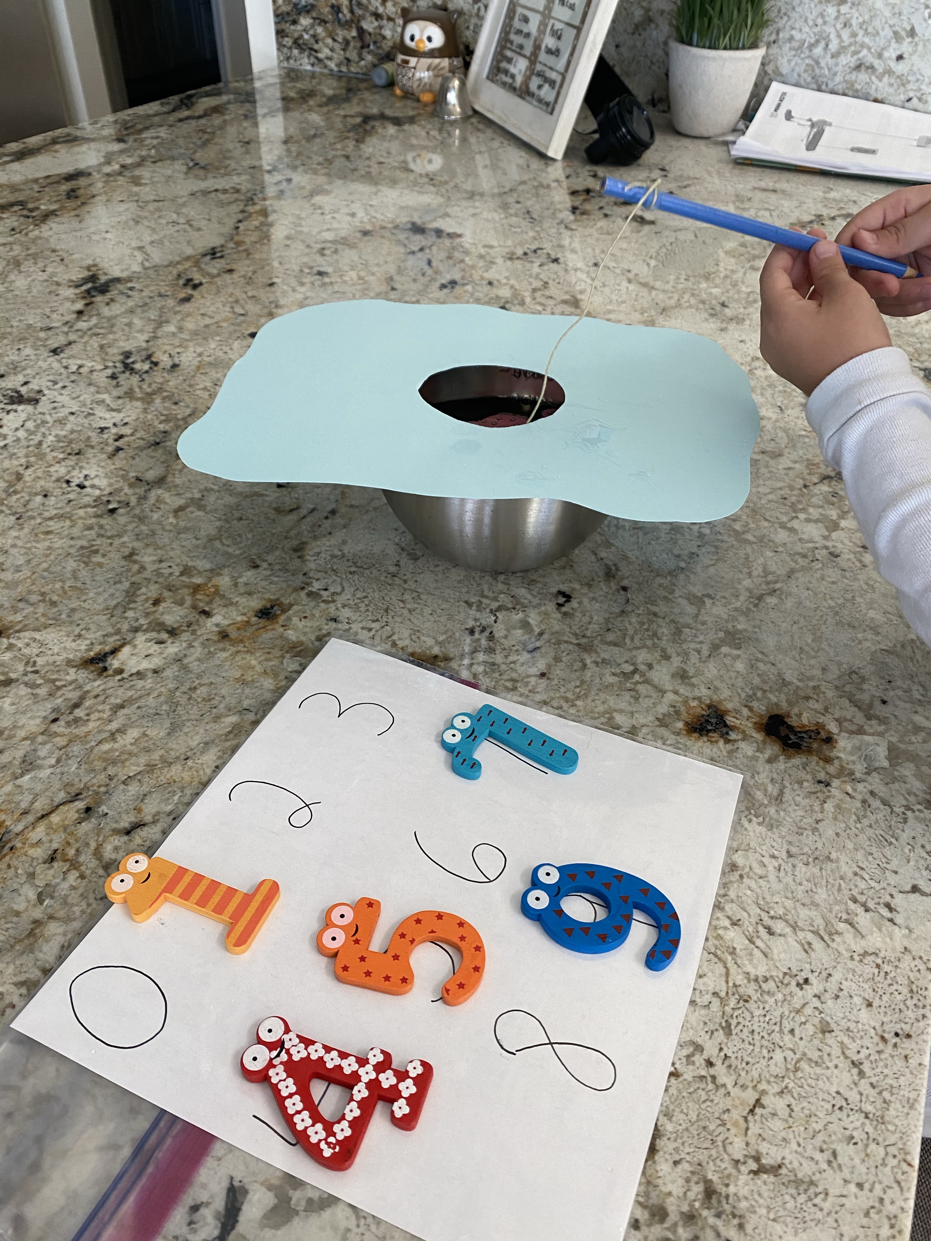 -Ice fishing for numbers: Oh my gosh, my little LOVED this activity! I made a fishing pole out of a colored pencil, some string and a magnet. Then I cut out an “ice fishing hole” from cardstock then hot glued it to one of our mixing bowls. I carefully put water in the bowl and plunked in some magnetic numbers then let him fish the numbers out. When he caught one, I would have him identify it and match it to the same number on a piece of paper I’d popped in a gallon Ziplock bag. When he was finished, he played ice fishing for a good half hour just for fun and asked to do it the next day too! I got this amazing idea from Turner Tots.