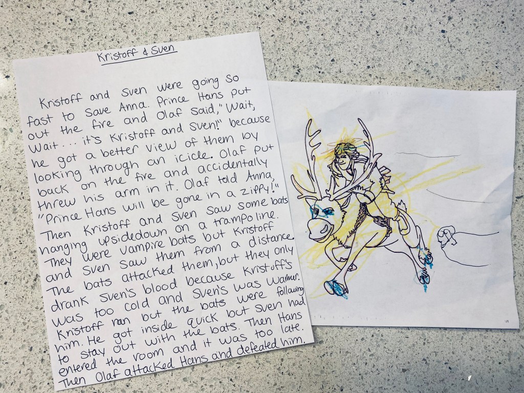 -Frozen story writing: Even pre-writers can create great stories, and oral story telling is wonderful practice for early writers who can’t yet write words themselves, so I had my little color a picture of Kristoff and Sven then tell a story describing why they were riding so fast. He started off retelling the actual ending of “Frozen”…then made a detour involving vampire bats (which he added to his picture)! hahaha I love their little creative minds!