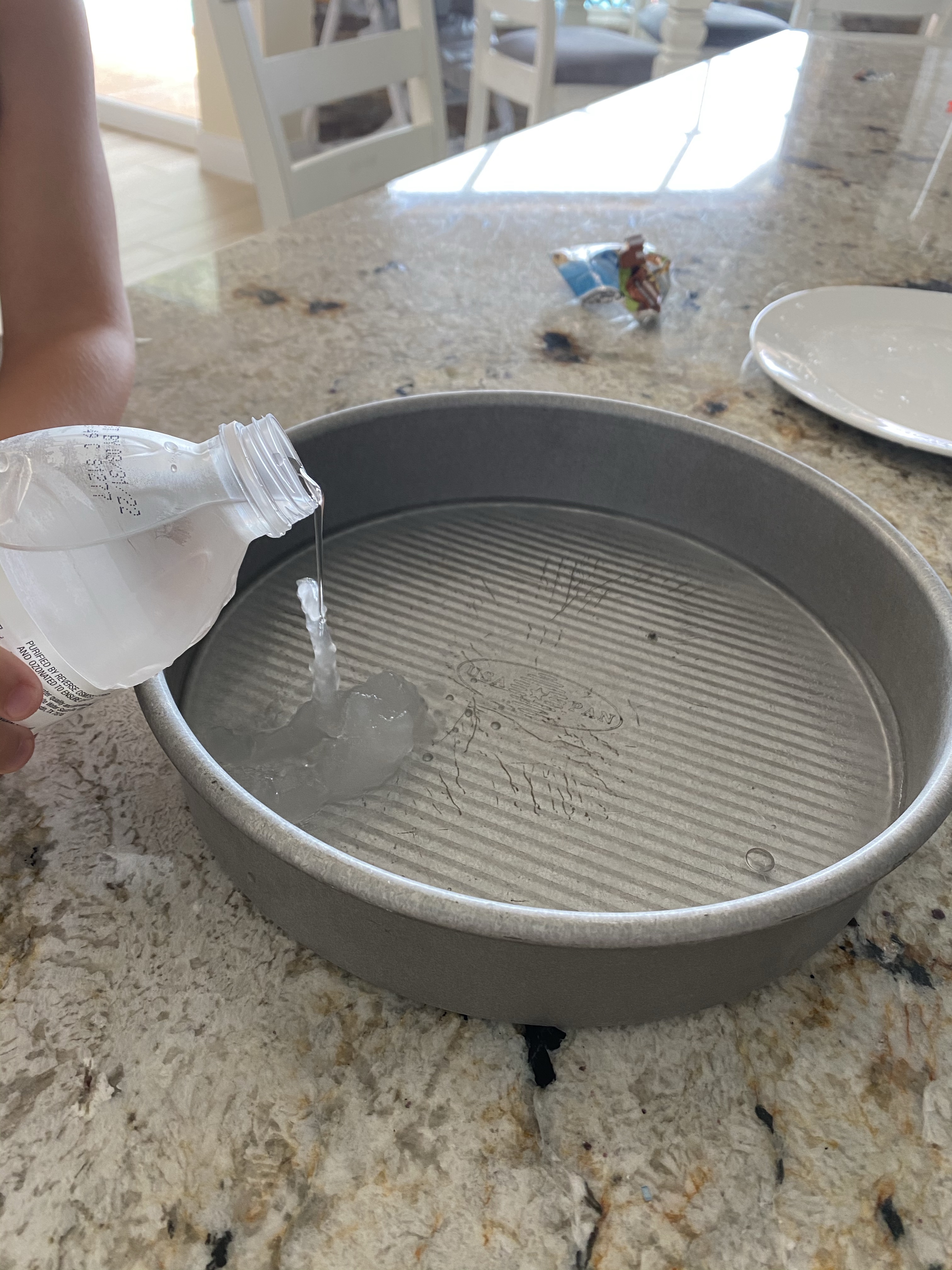-Elsa’s ice powers: You guys! THIS IS SO COOL! We ended up doing this activity several times during the week because it’s just so darn magical! You pop a few bottles of purified water and a cake pan with about 1/4 inch of water in the bottom in the freezer and set a timer for two hours. The goal is to get it SUPER COLD but not freezing. VERY carefully and slowly take it out of the freezer (I set off the reaction just by grabbing the bottle too hard the first time!) and take the cap off. Give the bottle to your little and have them slowly pour it on the ice in the pan and watch as it magically freezes as it hits the ice! When the whole bottle was poured out, I let the boys play with the ice (which was more like really wet snow!) I got the idea from For Every Mom, who also explains the science behind “super cooling”.