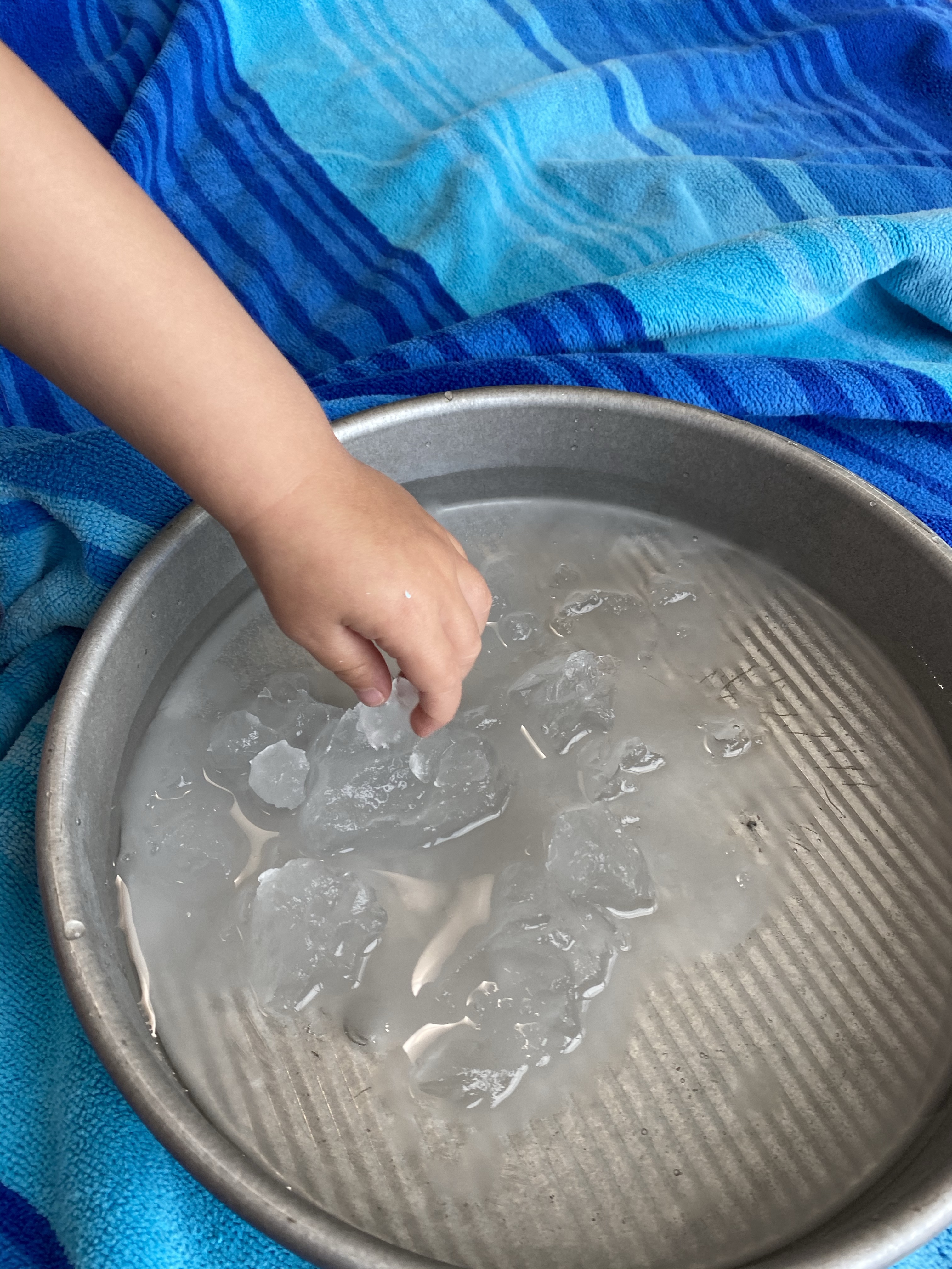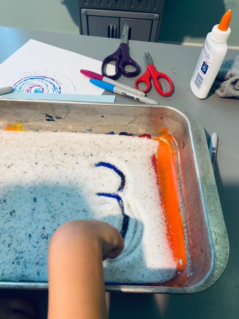 -Number writing in snow: If you’ve been following me for awhile, you might still have a baggie full of sugar and sprinkles (aka pixie dust) somewhere from the pixie dust sensory play activity I posted in my Disney World toddler blog! If you do- go ahead and grab that to use it again, if not, just sprinkle a VERY thin layer of sugar in a cake pan (tip: I painted an old cake pan rainbow colors then threw a layer of decoupage on top so it looks more fun when we use it as a writing tray!) – you can add sprinkles if you want to, but you don’t have to! Then, write numbers in the “snow” with your finger and have your little tell what they are and then either trace your writing or try it on their own.
