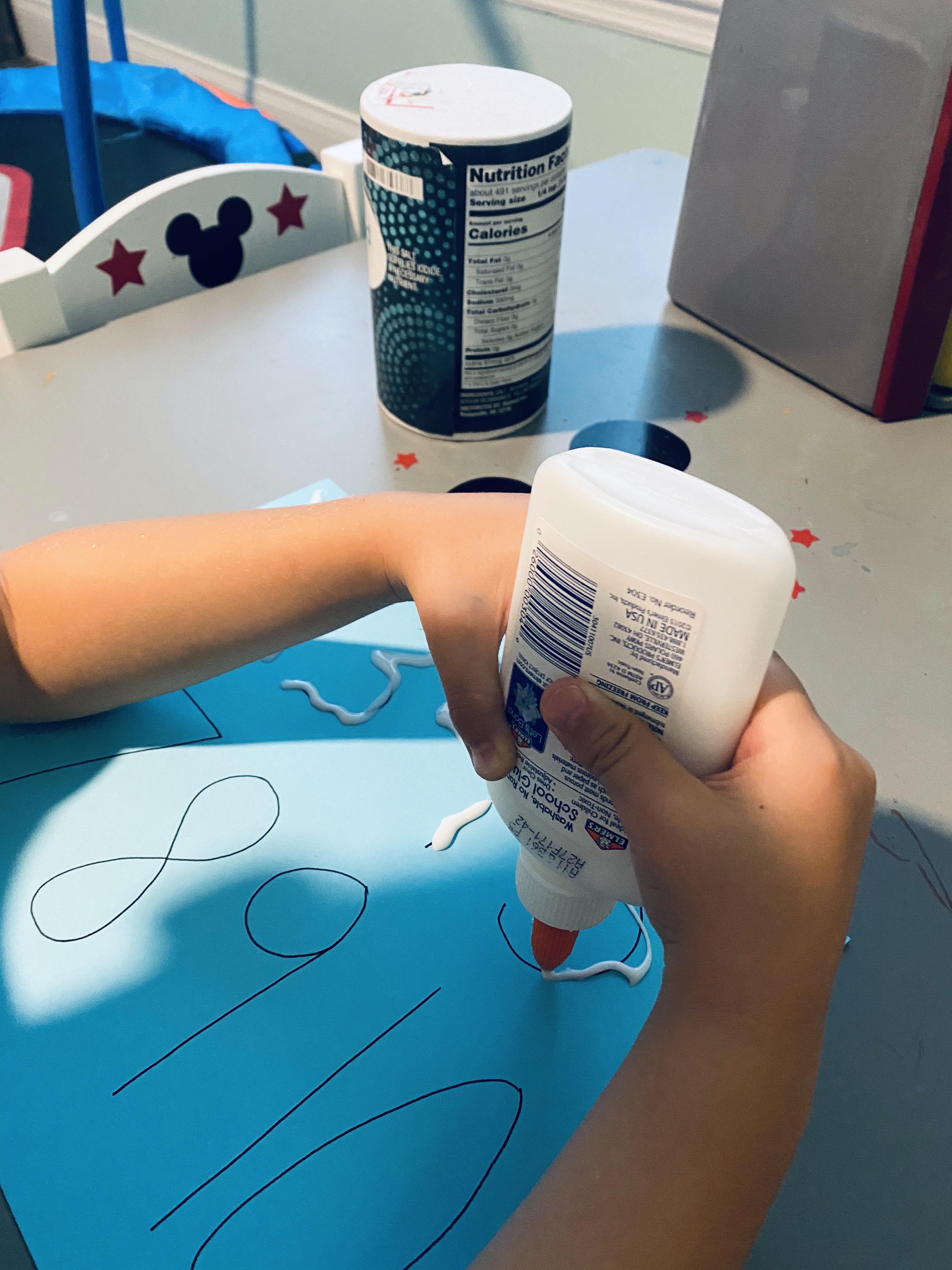 -Snowflake name practice: I wrote my little’s first and last name then had him trace the letters with glue and stick snowflake confetti on it to make the letters. As he worked we reviewed the letter names and sounds.