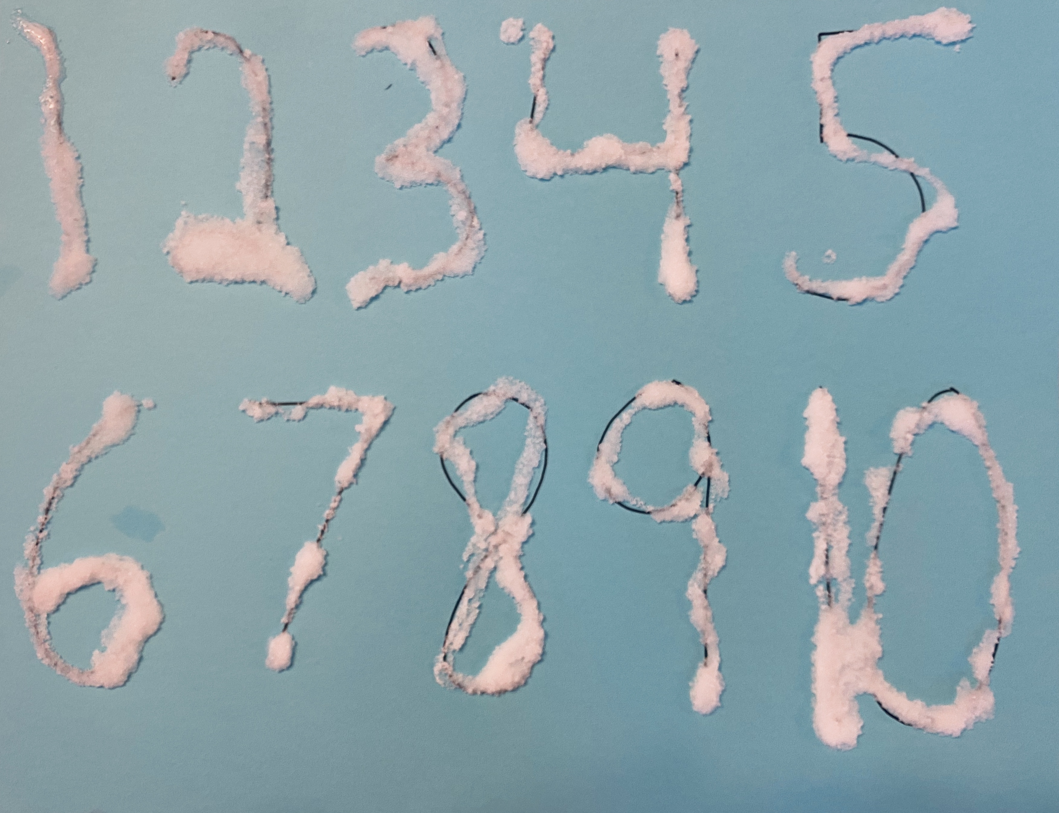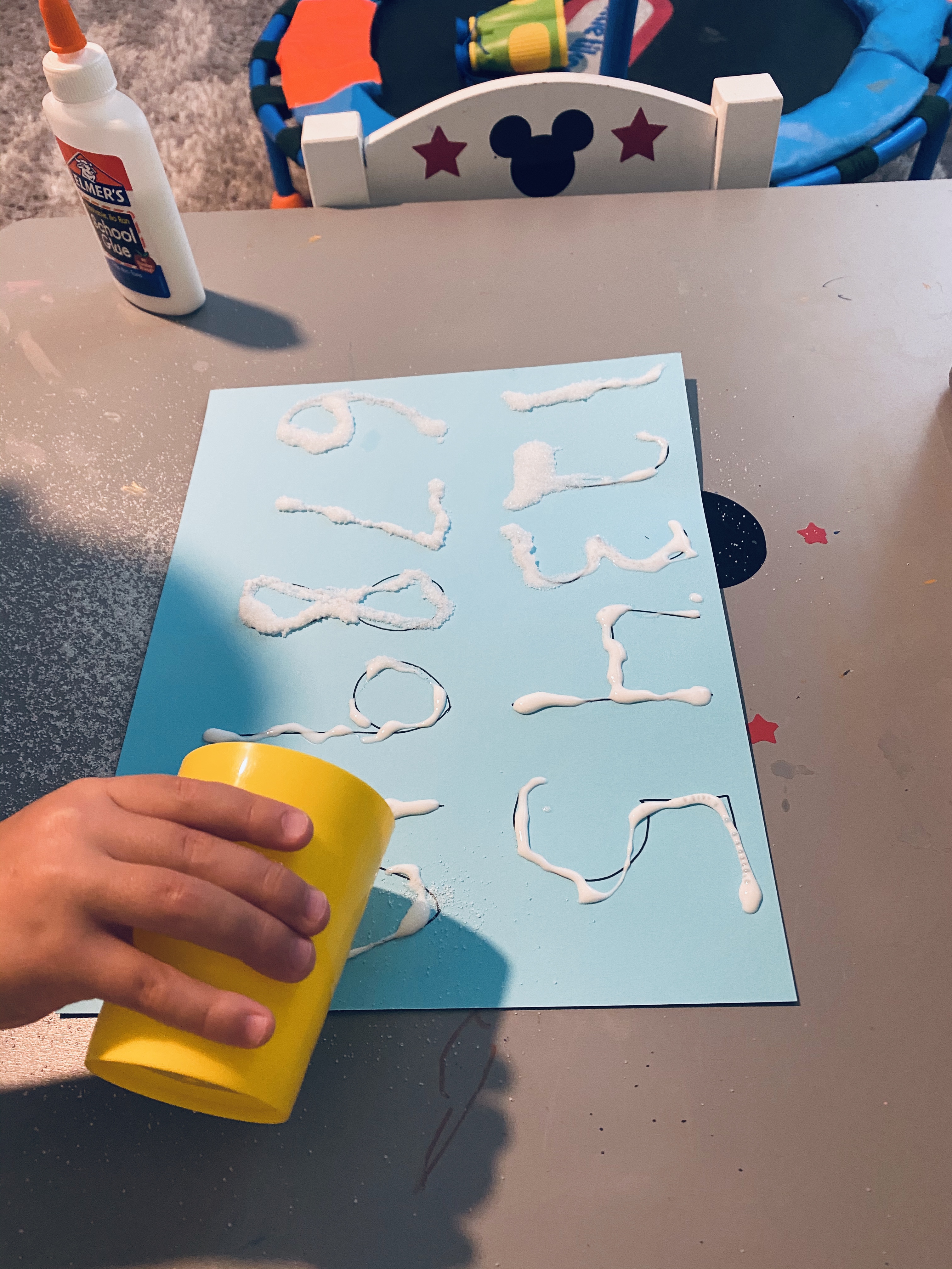 -A sprinkle of snow number practice: Write the numbers 1-10 on a piece of blue paper or cardstock. Have your little carefully trace the numbers with glue (you may need to show them how to do this first- it can be tricky and is different than writing numbers with a pencil) while you talk about their names together. Then sprinkle salt or sugar on them- you can also add in some glitter, but my little just wanted plain salt. Shake the excess salt/sugar off and voila! You have numbers made of snow! I was SO proud of how neatly my little did this- he really took his time and his numbers came out so good!