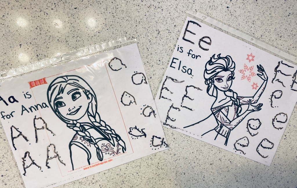 -E is for Elsa, A is for Anna: I printed a picture of Elsa and a picture of Anna in the “landscape” orientation then made capital and lowercase Es and As around them with dots. I tucked them each in a page protector and had my little practice writing the letters with a dry erase marker.