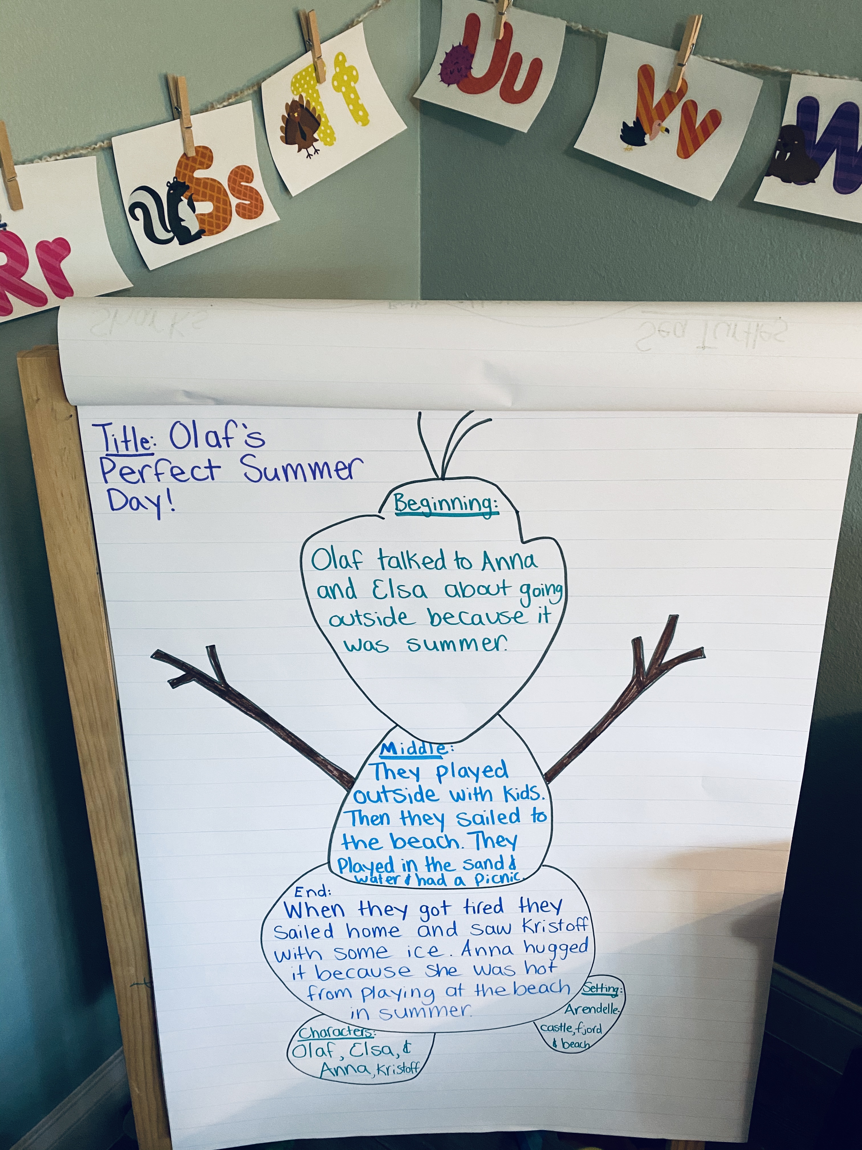 -Olaf story and retelling: We read “Olaf’s Perfect Summer Day” from a Frozen story collection we got a few years ago (I highly recommend it for any little Frozen fan- the stories are cute, short, and engaging with fun and colorful illustrations!). Then my little helped me fill out an Olaf graphic organizer I drew by telling me what happened in the beginning, middle and end of the story.