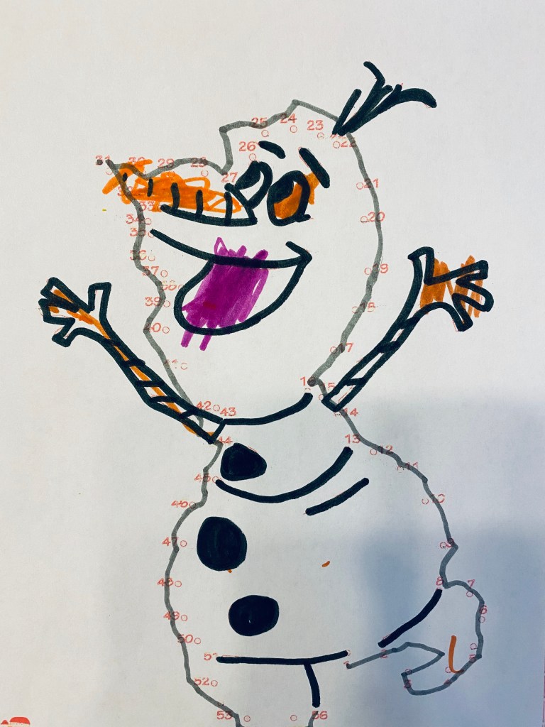 –Connect the dots Olaf: My little connected the dots as I pointed to and counted the numbers for him to work on number recognition and fine motor skills.