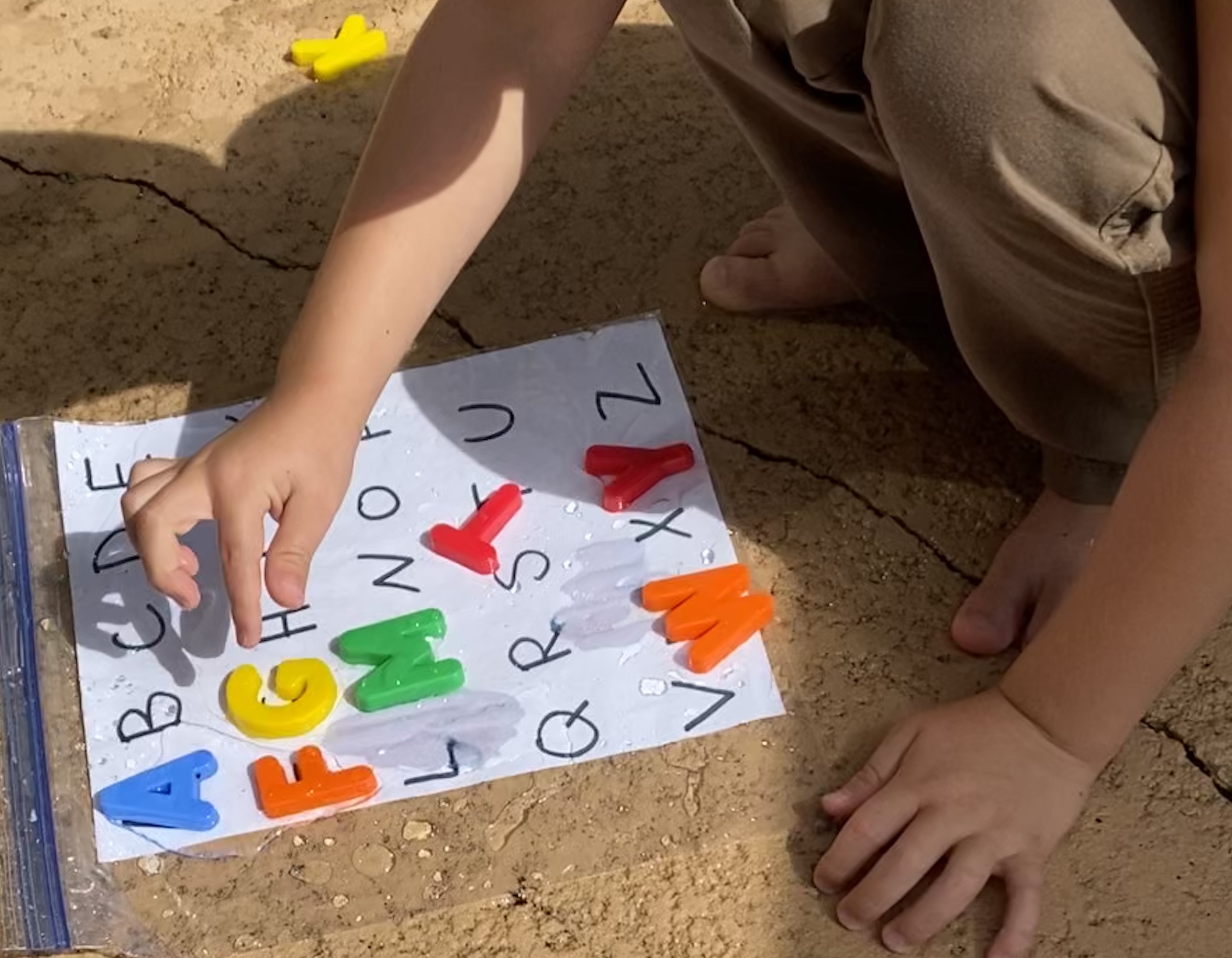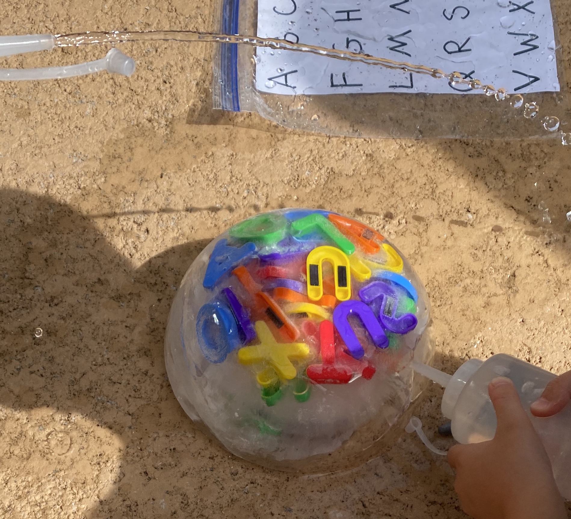 -Frozen ABCs: Throw some plastic ABC magnets (the kind that you usually have all over your fridge!) in a bowl, add some water and pop it in the freezer overnight. When it’s frozen, run some hot water over the bottom of the bowl to release the ice chunk. Give your little a squirt bottle full of warm water to “free” the letters from the ice. When they get one out, have them identify it and match it on a letter page in a Ziplock. (I used upper case for both, but you could also have your little match upper to lower!) I got this idea from Fun Learning for Kids!