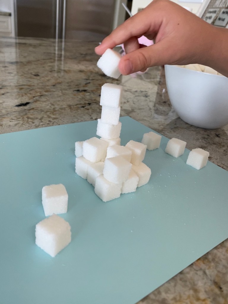 -STEM challenge…build Elsa’s ice castle: Give your little a bowl of sugar cubes (blocks work too!) and have them build Elsa’s ice castle with them! I challenged my little to build the tallest castle he could- giving this specific task made him work more on critical thinking, problem solving skills and engineering skills (in short- if you just stack one cube on top of the other, you can’t build very tall, especially if you stack them crooked! Building a wider base allows your tower to be more sturdy and thus you can make it taller!) I got this idea from Left Brain Craft Brain!