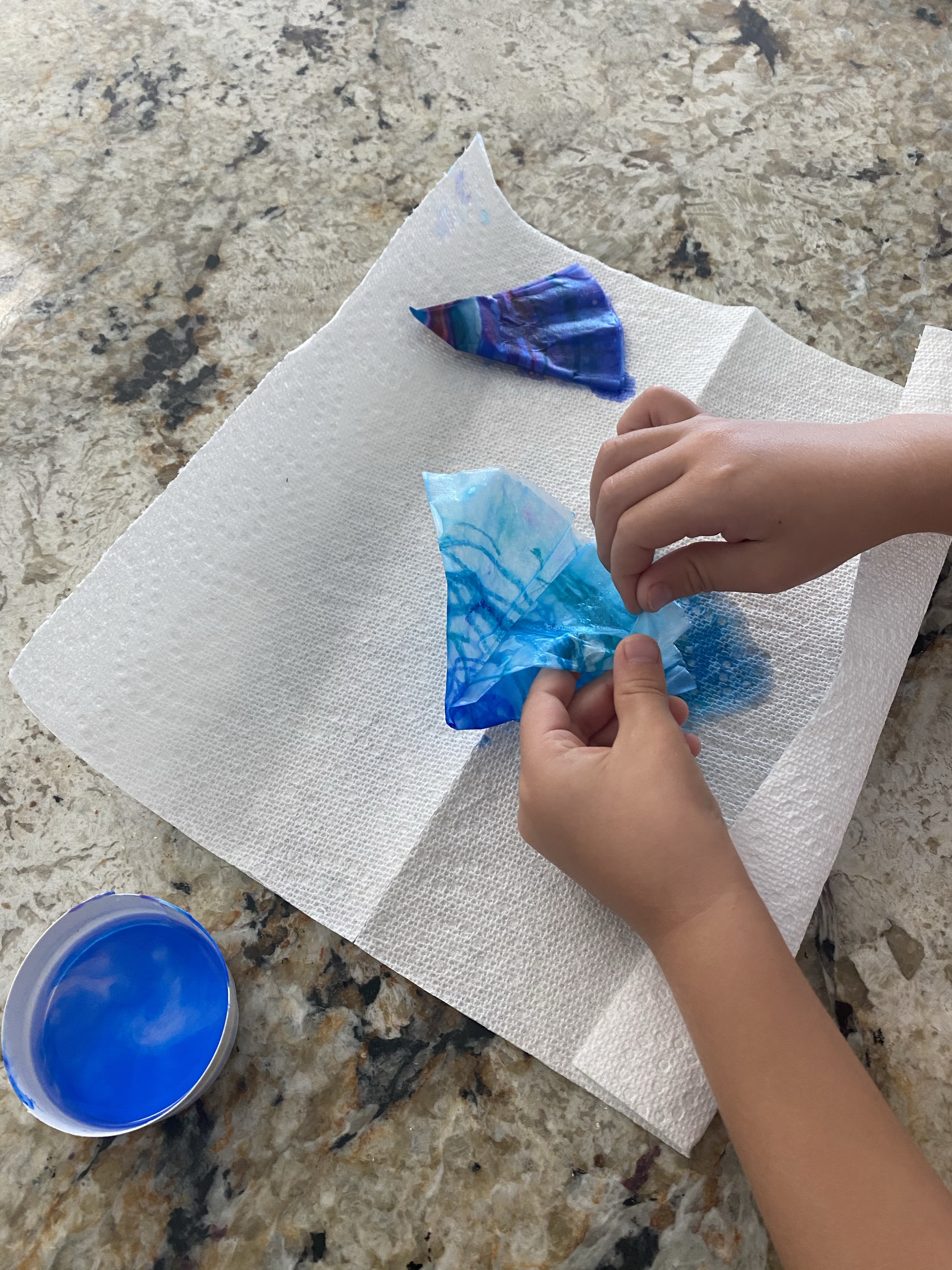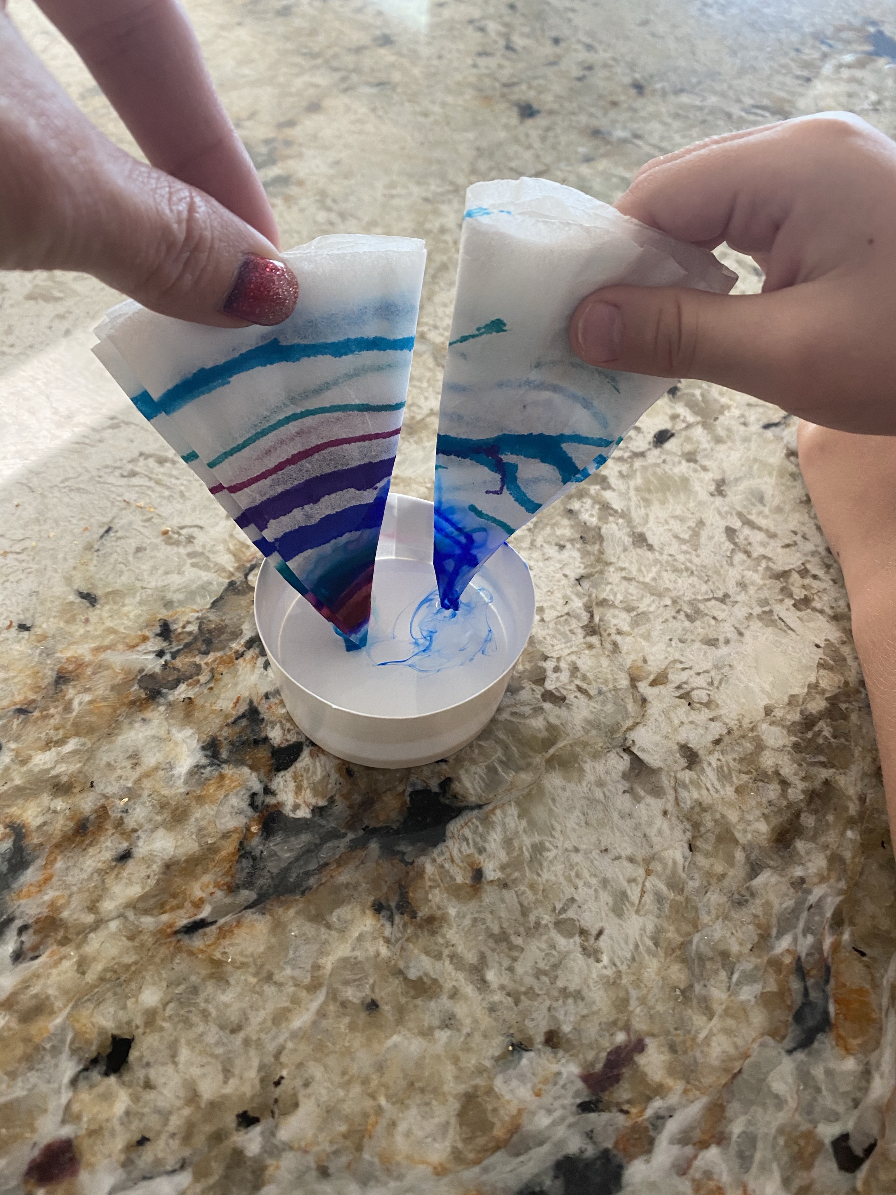 -Tie dye snow flakes: Have your little color a coffee filter with sharpie markers in a circle shape using blues, purples, pinks and teals. Fold the filter in half, then in half again, then once more and dip it in rubbing alcohol so the whole filter is covered (we just slowly dipped the corner in, then took it out and flipped it upside down and that did the trick!) Slowly open the filter and lay it on a paper towel to dry. Once it’s dry, refold it and cut shapes out of the sides to make a snowflake! You might be able to do this with water based markers and then just use water instead of rubbing alcohol, but I haven’t tested it! I got this from Around the Kampfire and added the “turn it into a snowflake” bit!