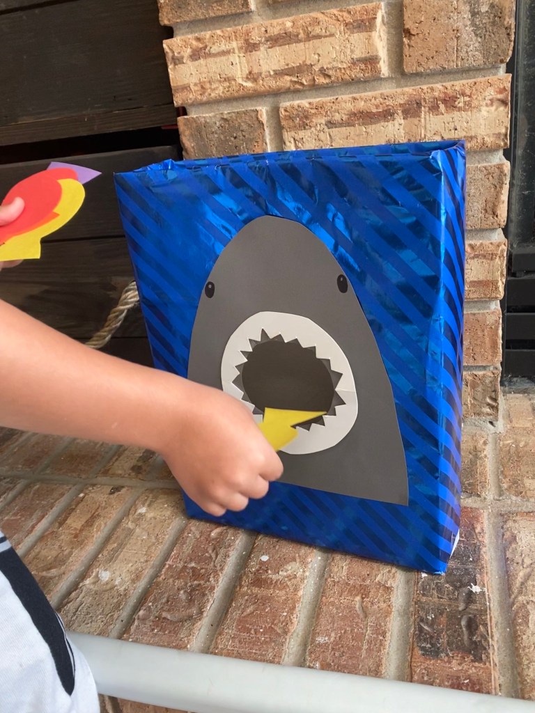 -Feed the shark alphabet practice: I made a “hungry shark” out of a cereal box I decorated (if you need instructions they’re under my toddler post “Baby Shark Dodo Dodo Dodo“.) Then I made several fish out of construction paper and wrote upper and lowercase letters on them. I had my little identify the letter and sound (I helped him when he got stuck, and he repeated me) then feed it to the shark!
