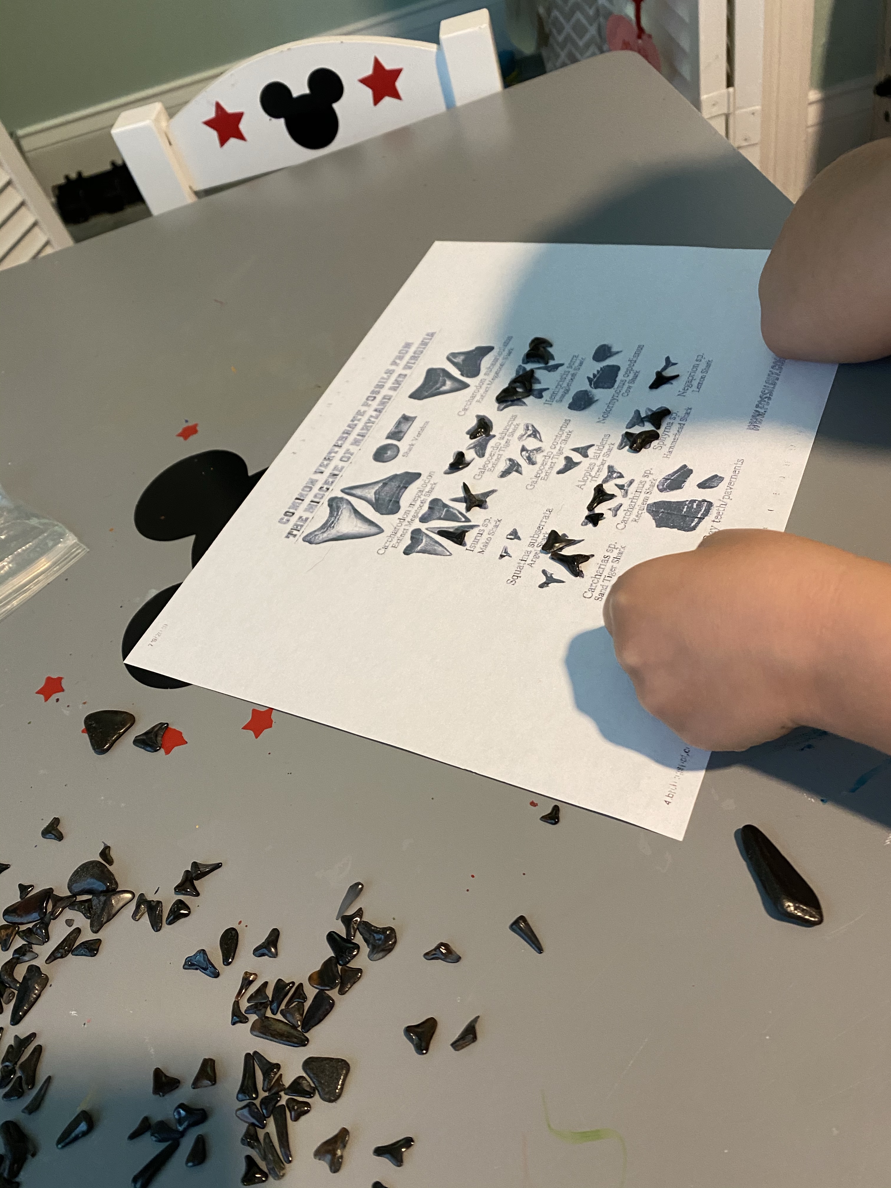 -Shark tooth identification: If you don’t have a collection of real teeth, you could look at the different types of shark teeth online or just skip this one. Since we have several, I printed out a prehistoric shark tooth identification page and we used it to try to identify some of the nicer specimens I have. We found tiger, snaggletooth, mako, thresher, lemon, requiem, hammerhead and sand tiger!