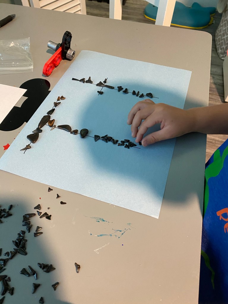 -Shark tooth shapes: I drew shapes on a page and had my little trace them with shark teeth while we talked about their names and what they looked like. (somehow I forgot triangle so when we were done we split the shapes with straight lines in pieces to make triangles- it actually ended up be a good addition to the lesson to practice shape decomposition and visualizing!)