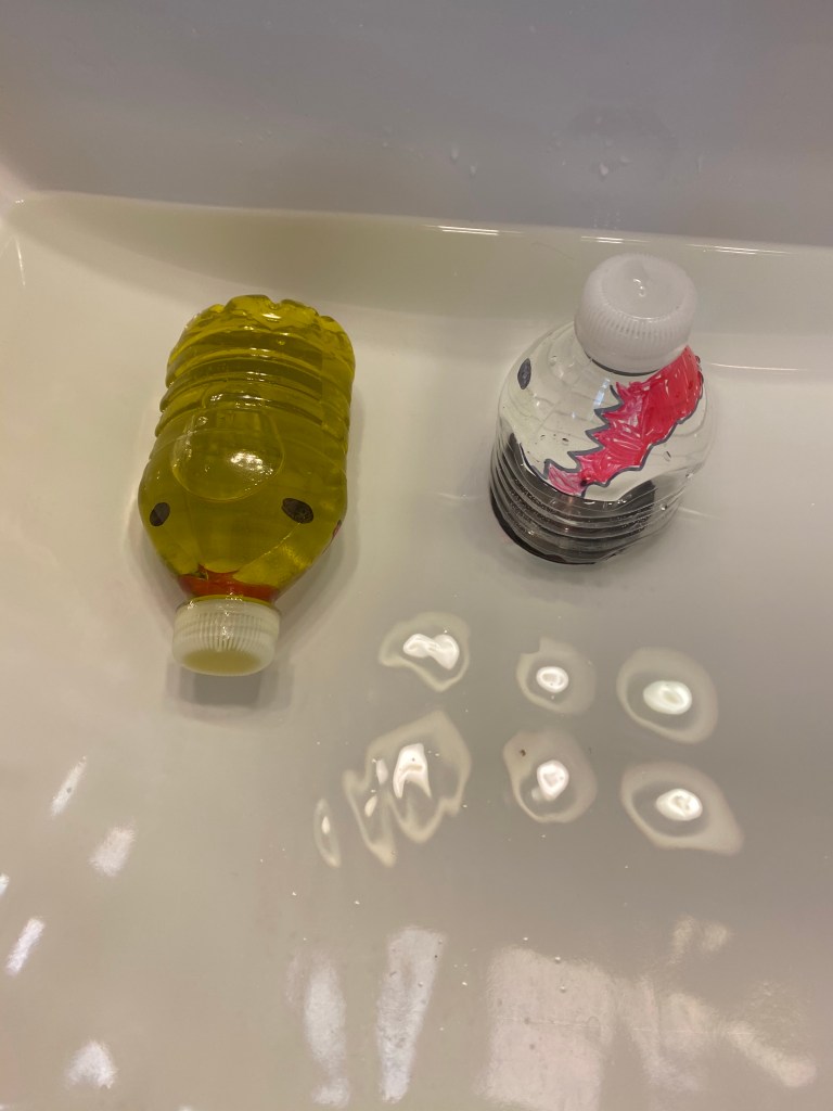 -Why do sharks float?: Sharks are very large, and very heavy and technically should just sink right down to the bottom of the sea. They don’t have swim bladders like other fish which allows them to quickly change depth while attacking their prey without exploding. (A swim bladder is a bag most fish have in their bodies that they can inflate and deflate with air to help them be more buoyant.) So why do they float? First, continually moving helps them stay up, but also their huge, oily livers! We did an experiment to show this by filling two small water bottles- one with cooking oil and one with water- and placing them in a water filled sink. The water filled bottle didn’t float as well and the oily one stayed up because it was lighter than the surrounding water! I got this idea from Little Bins for Little Hands!