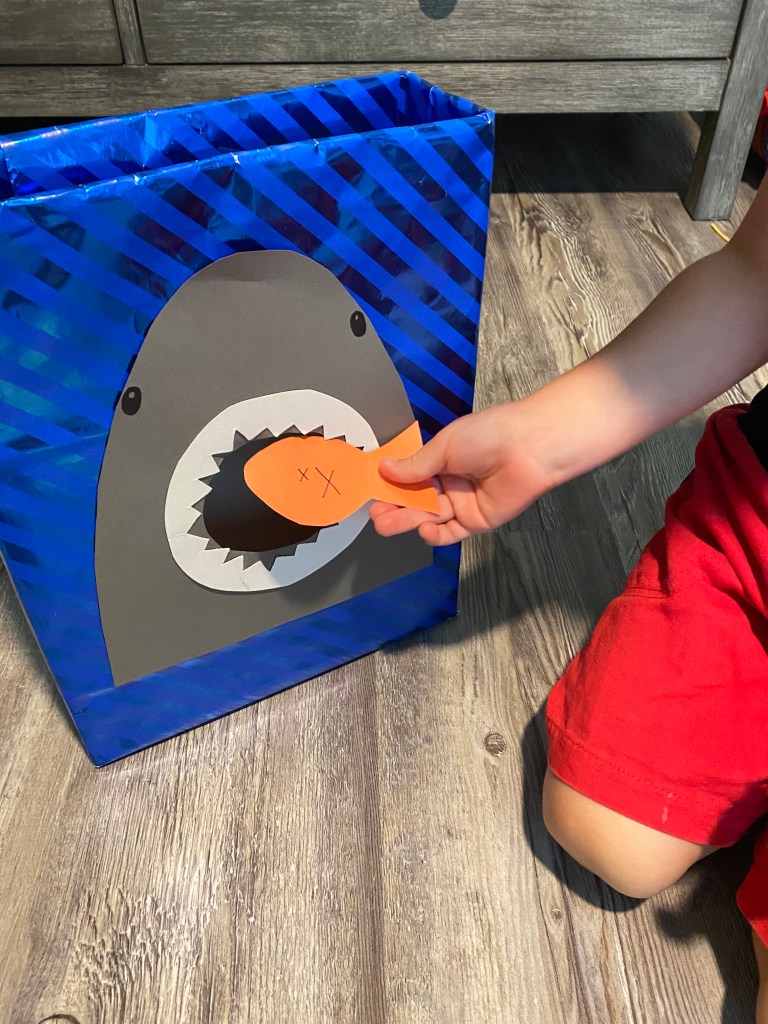 -Feed the shark counting practice: I made this for my toddler originally, but my preschooler thought it was cool so I let him play with it too. I had him count the fish as he fed them to the shark. For instructions on how to make the shark, swim on over to the toddler post “Baby Shark Dodo Dodo Dodo“.