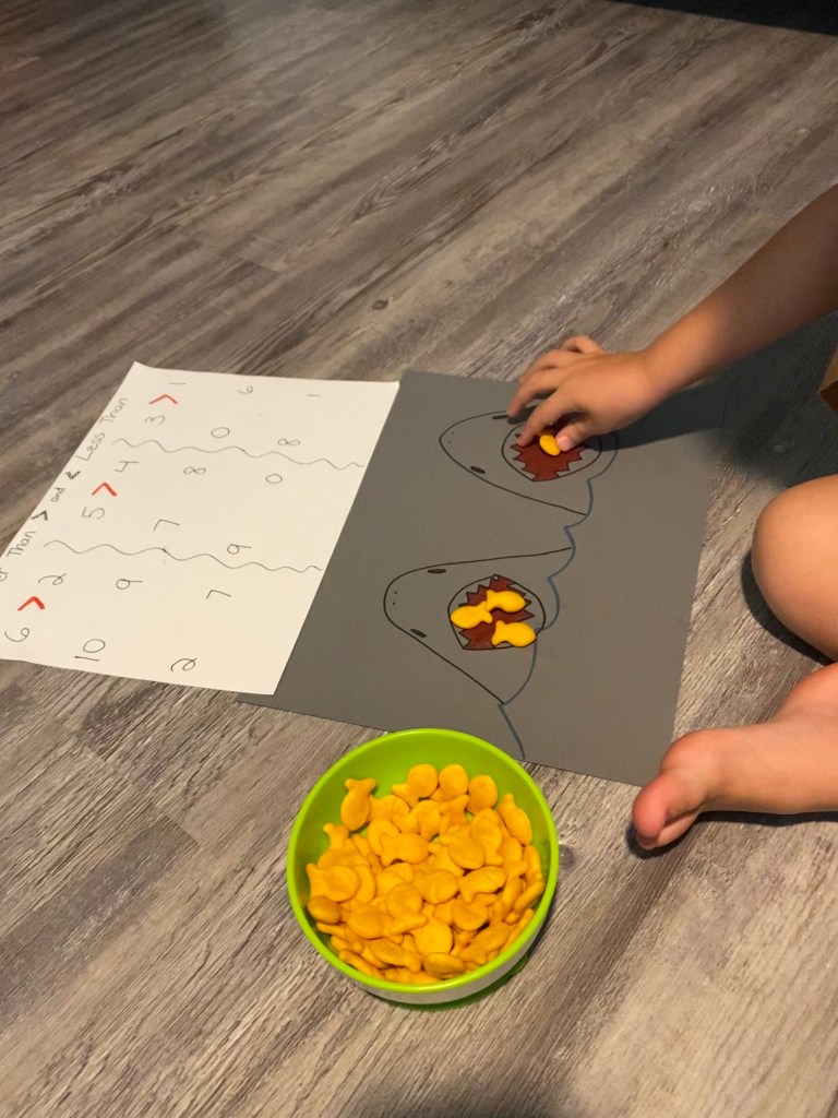 -Hungry shark greater than, less than practice: I had my little compare numbers by identifying each number, showing it with goldfish (ie. feeding the correct number goldfish to “sharkie 1 and sharkie 2” which I drew on paper) and then comparing the groups to see which one is bigger. I introduced him to the “greater than” and “less than” symbols by explaining the “hungry shark mouth” opens toward the bigger number. In my classroom I used to teach this with “hungry alligators”. I got the hungry shark idea from 3 Dinosaurs, who also included printables (which I didn’t use because my printer is down- the struggle is real! LoL)!