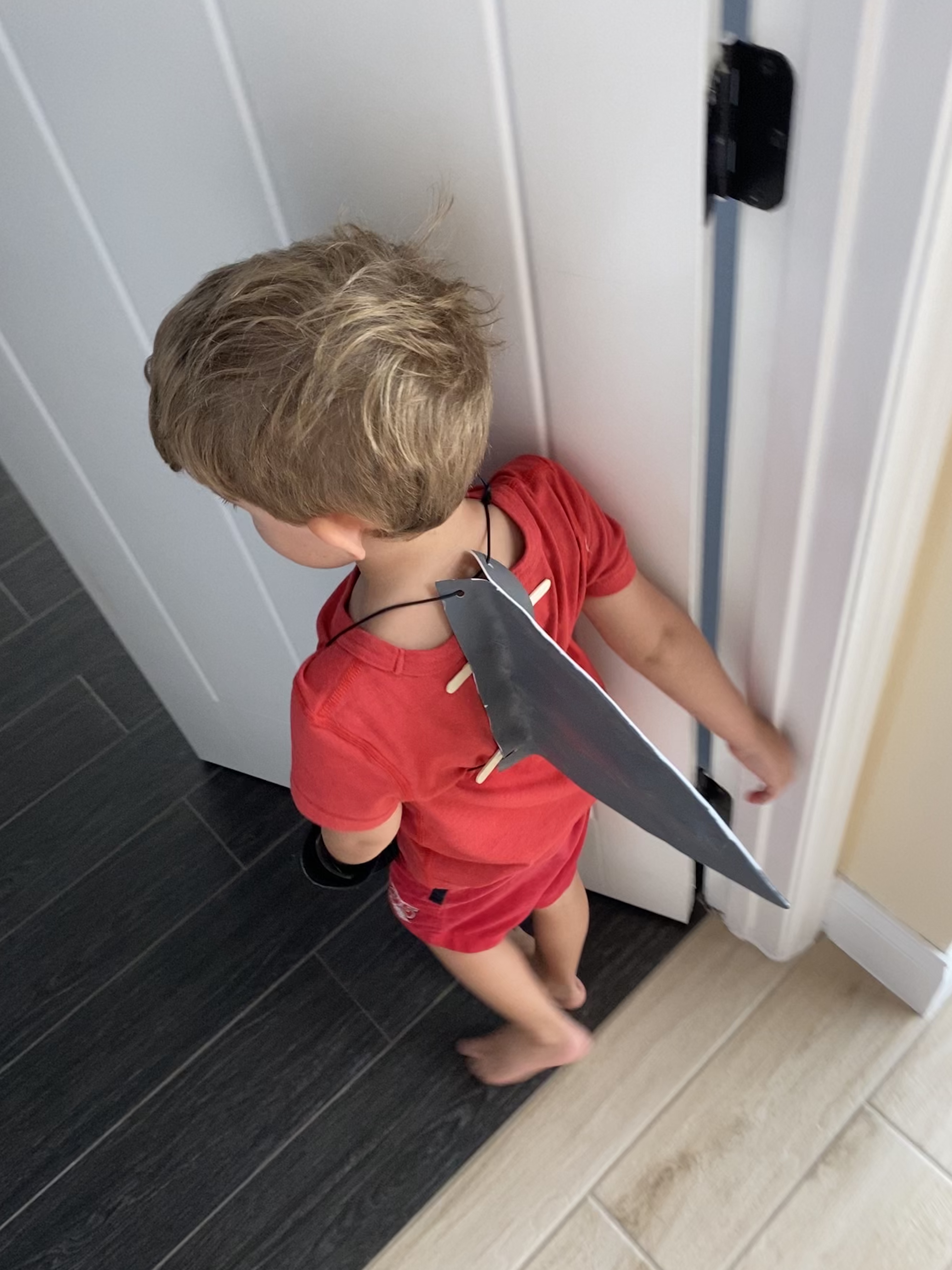 -Make a shark fin: Shark week wouldn’t be complete without making a fin for imaginary play! We cut ours out from two layers of craft foam- I was all out of grey, so my little painted it. After it dried, I glued the two halves together with hot glue, punched holes at the two bottom ends, threaded string through them in a circle and tied it. Then we added a few popsicle sticks for support, as well as a pencil inside to help it stand up. My little had a blast running around pretending to be Shark Boy!