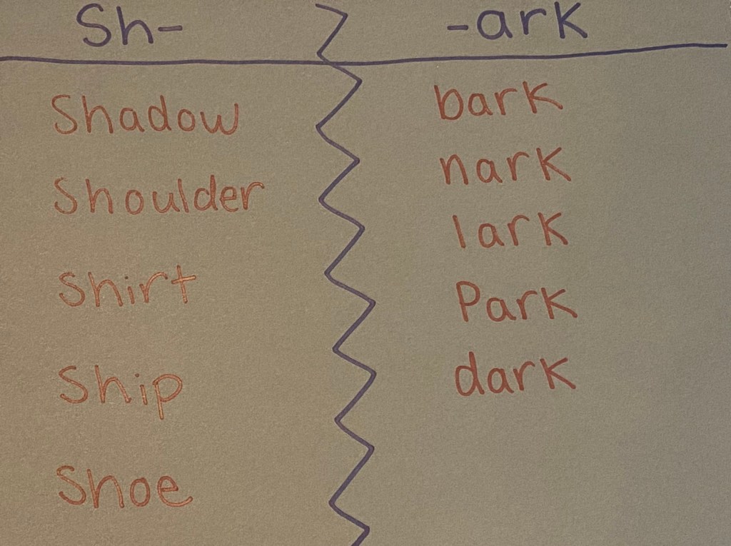 -Shark rhyming and alliteration: I broke apart the word “shark” into sh- and -ark. Then I had my little think of other words that rhymed with shark (-ark family words) and words that started with sh-.