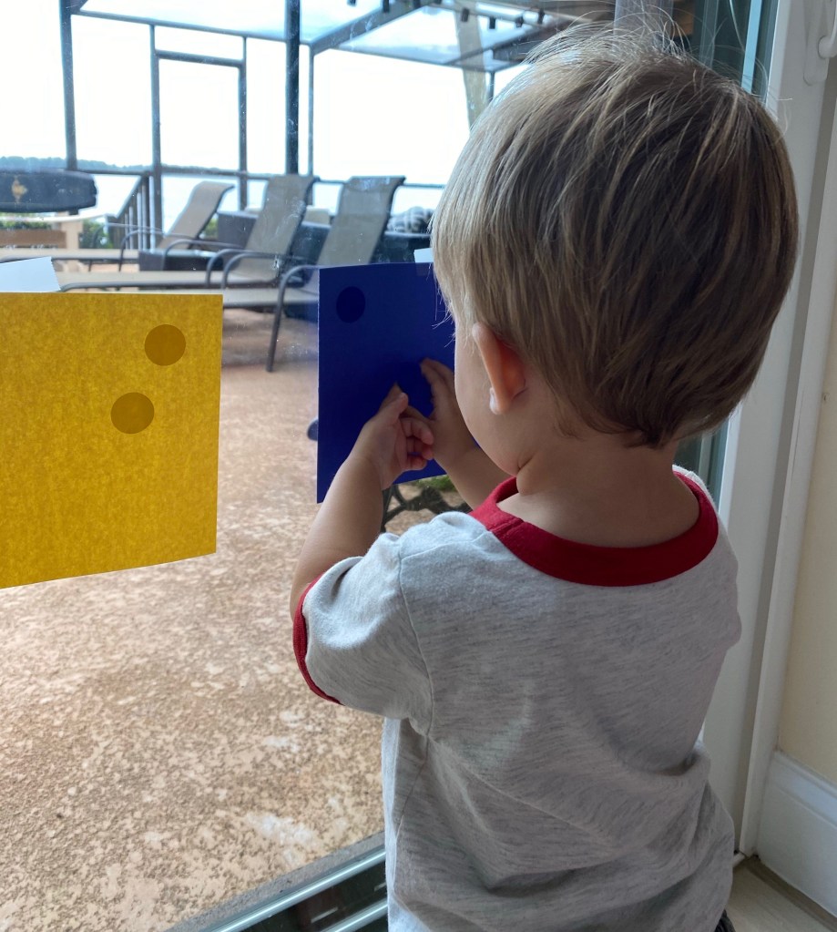 –Dot sticker sorting: This idea is so simple, but so fun! I mean what toddler doesn’t love stickers? I just taped two colors of construction paper on the wall (one yellow, one blue) and showed my little how “yellow goes on yellow, and blue goes on blue”. Then I gave him a few stickers to sort! This is an activity you can do a few days in a row, especially because toddler attention span is about 5 minutes! LoL My little sorted 3 of each color then ran off!