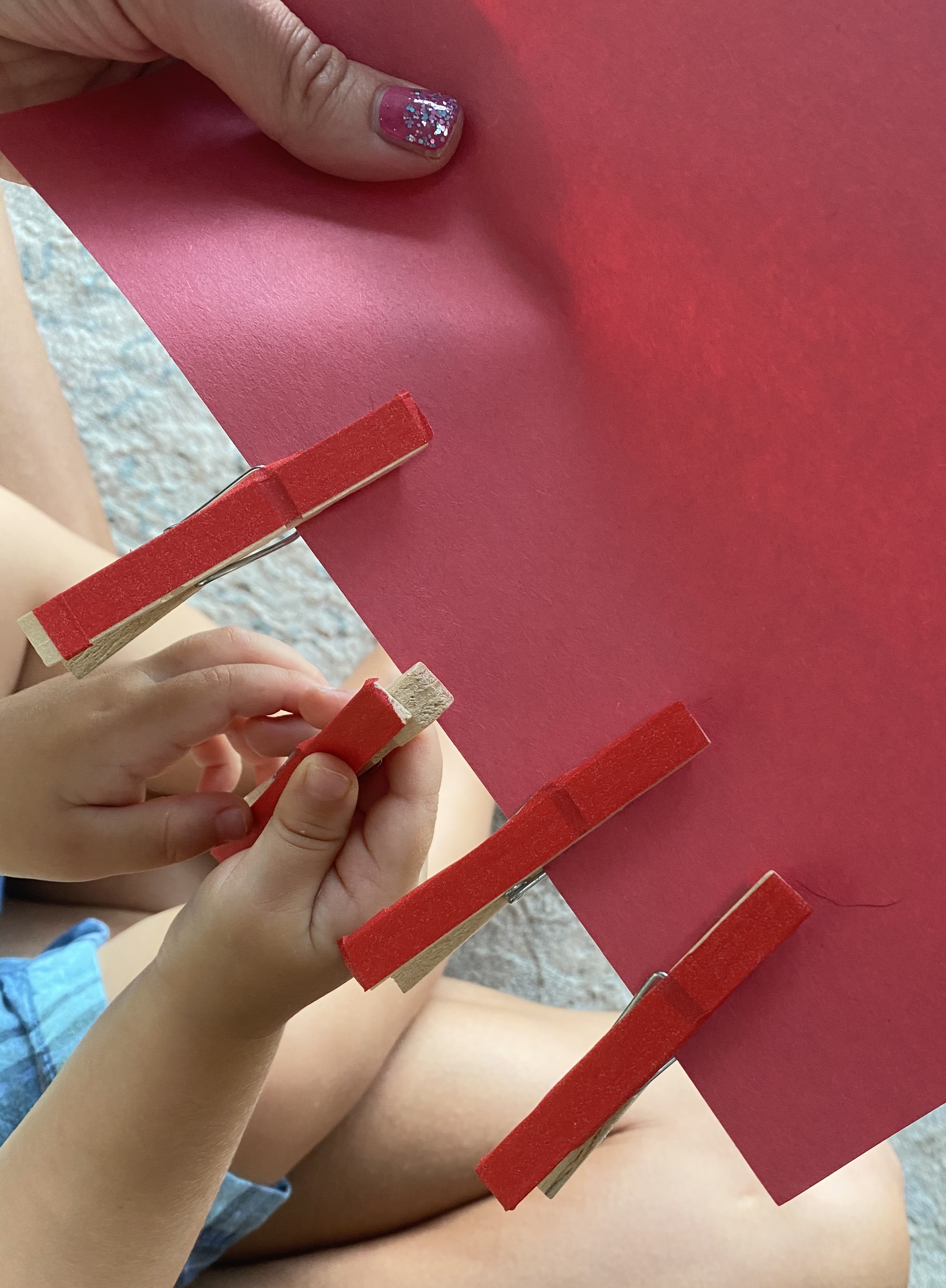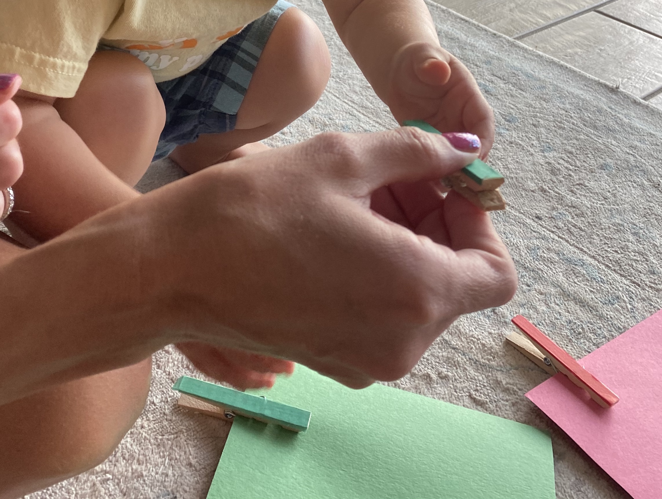 –Clothespin color sort: I’ll start off by saying this one is probably better for kiddos who are 2 years old or close to it! Their fine motor strength is barely there to get a clothespin to work! My little struggled a bit, but I showed him how to do it and he thought it was fun so we continued the activity. If you find it’s too hard for them to work the clothes pin, you can sort with blocks instead! I just threw some red and green washi tape on 8 clothespins and had my little clip the green ones on a green paper and the red ones on a red paper!