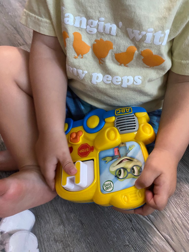 –Leapfrog ABC bus: Our neighbor gave us this bus as a hand-me-down and both of my boys love playing with it! It sings letters and sounds, the ABCs, and builds fine motor skills when they change out the letters! It’s a little bit pricey at $20, but it’s a fun learning toy to have around! Here’s the link on Amazon if you want to check it out!
