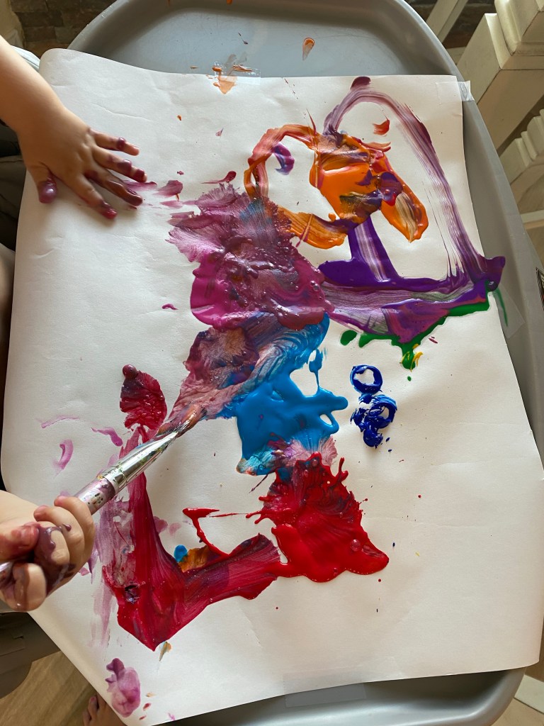–Painting: Sometimes it’s fun to just let your little explore with paint rather than having a set painting “project” that’s supposed to look like something! I taped a large piece of paper on his high chair tray, squirted blobs of each color on the paper, gave him a brush (I asked if he wanted to use his hands or a brush and he said “brush!”) and let him swirl and mix to his content! He was naming the colors as he went, so I pointed them out to him too (since he still mixes them up! Everything is “boooo”!)