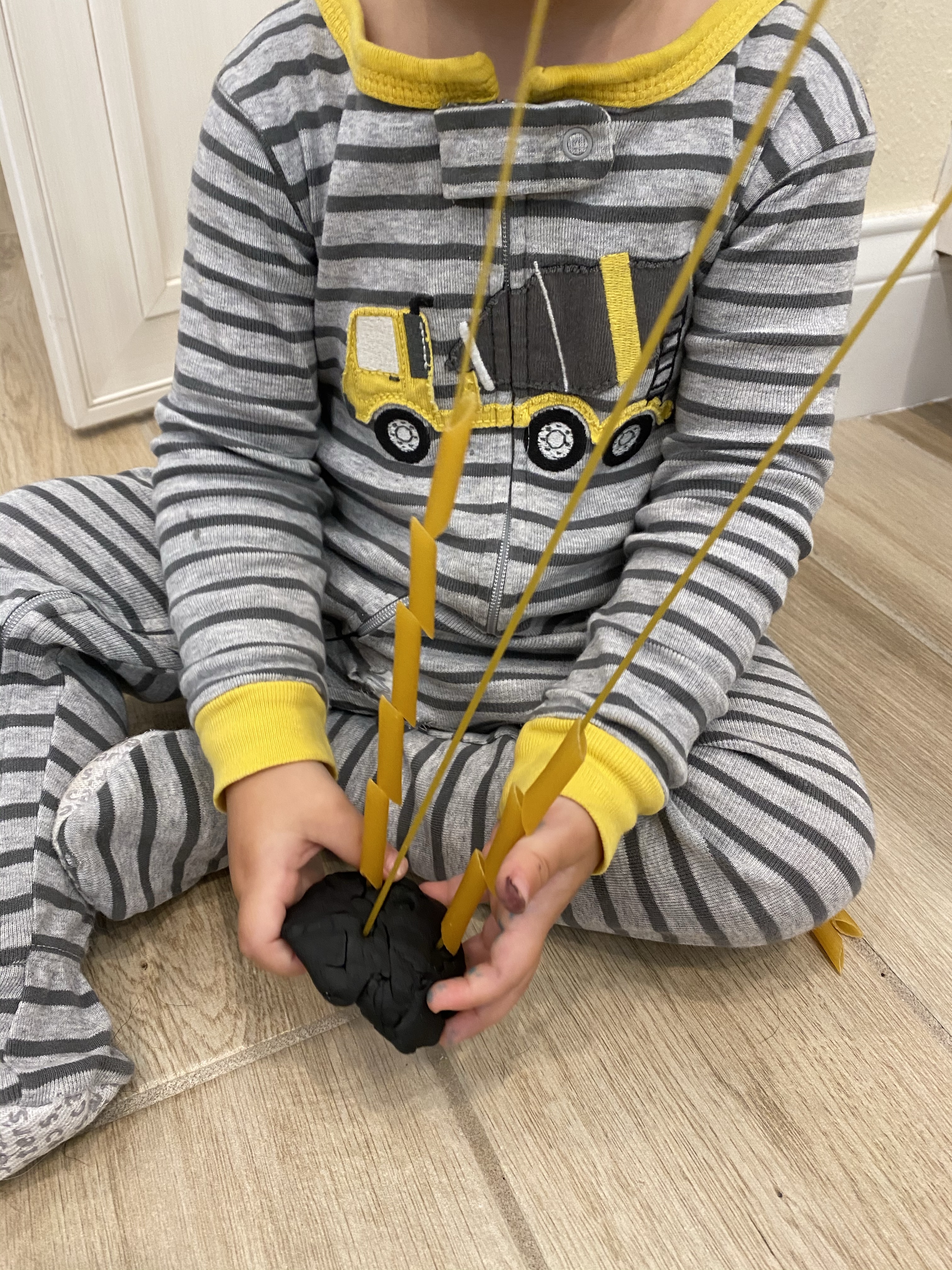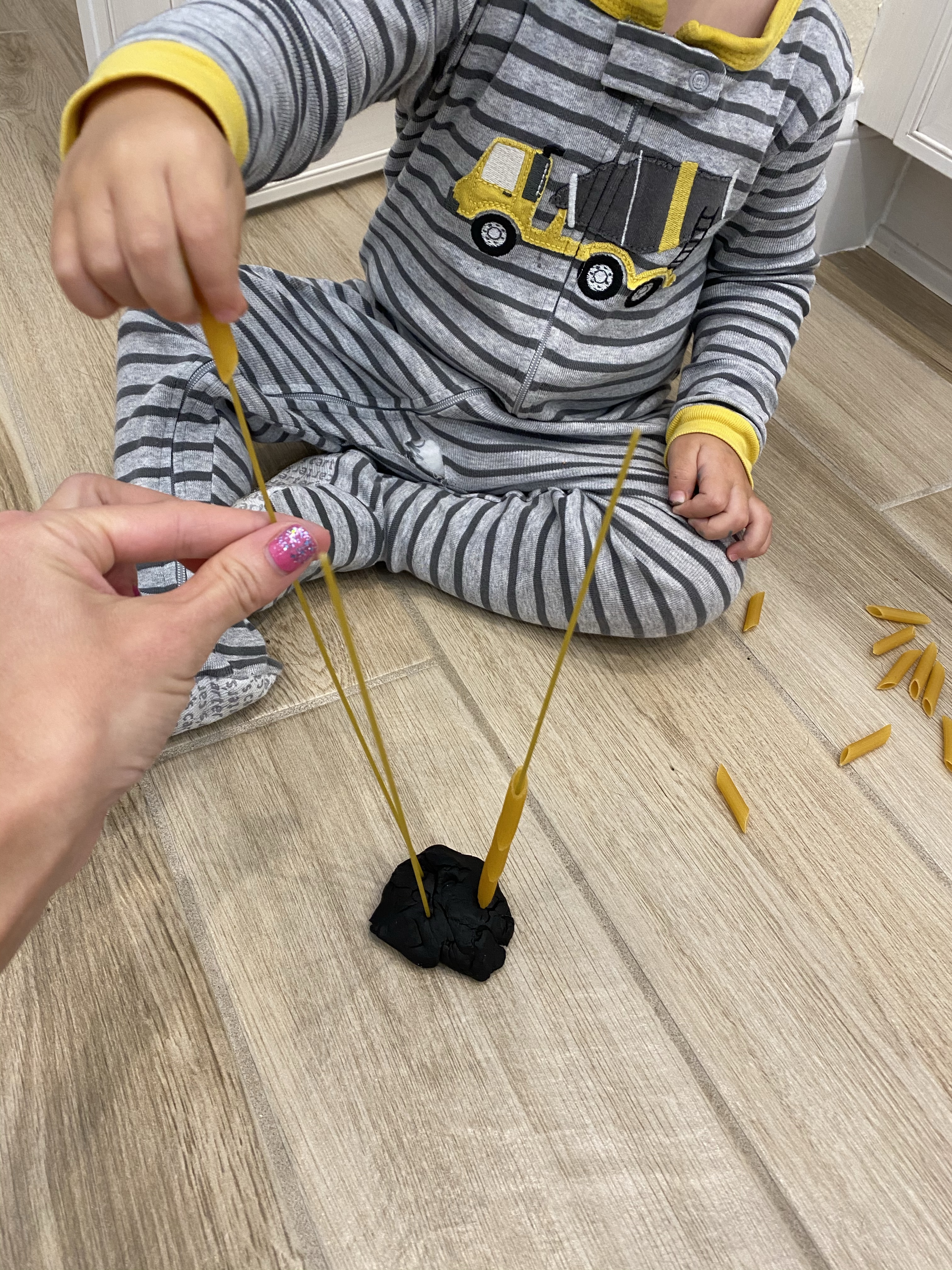 –Pasta threading: This activity was a hit with my toddler and SO easy to set up! You just poke some spaghetti noodles in a piece of playdough and have them thread ziti noodles on the spaghetti! I had to hold the spaghetti steady for him, but he thought it was so cool threading them and did several before yanking the spaghetti out of the playdough and just playing with the whole set! I got the idea from my friend Renee who did it with her toddler ages ago and posted a picture on Facebook! Laughing Kids Learn also has a similar activity, only using straws and larger noodles! (we had small ones on hand so hence the spaghetti!)