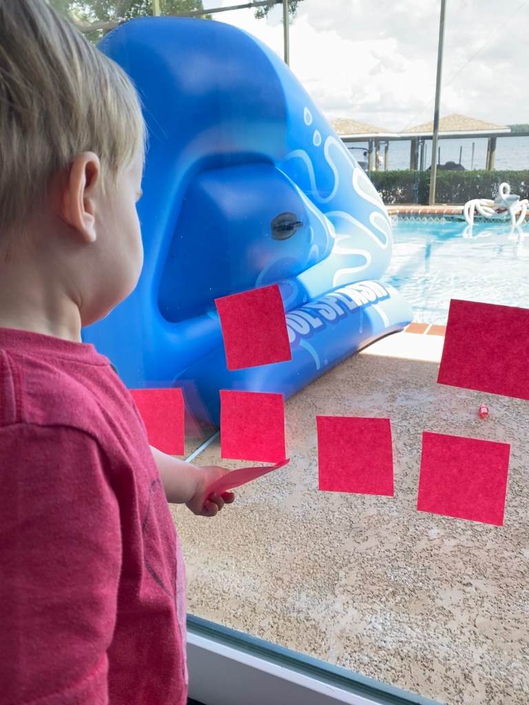 –Post it pull and count: This is another easy one that both my boys were in to! You count out 10 post it notes while sticking them to the wall, then count them again as your little pulls them down! BAM! Counting practice! I thought about writing the actual numbers on them to build number recognition, but lets be honest- most toddlers are going to pull them down in a random order, so I skipped it! I got the idea from Teach, Investigate, Play!