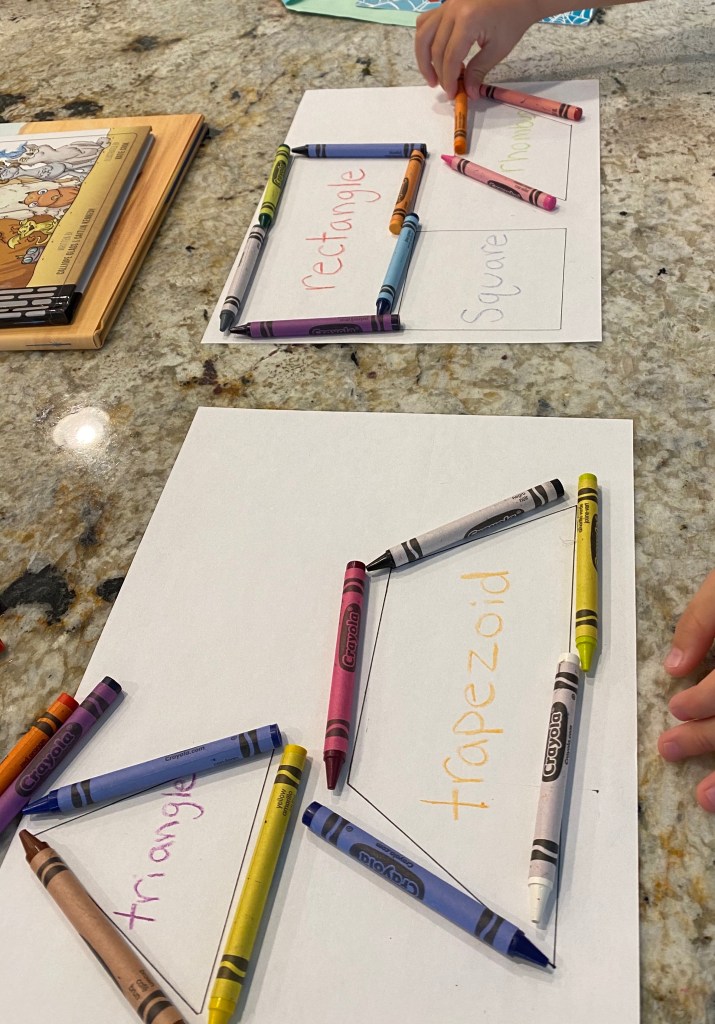 -Crayon shapes: I made a shape tracing page using crayon-sized sides (one crayon is 3.5 inches, two are 7 if you’re measuring the sides as you draw). Then I had my little build each shape with crayons as we reviewed it’s name! I got this idea from Toddler Approved.