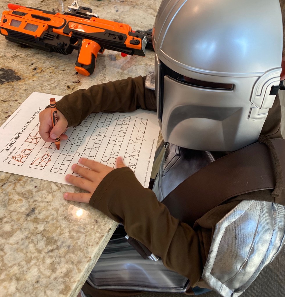 -Rainbow write the ABCs: I gave my little a box of crayons and had him practice writing all the capital and lowercase letters in the alphabet! He used brown the whole time to match his Mandalorian costume, but you can have your little switch colors each letter or line if they want to, to make it more of a rainbow! LoL We went over the letter names as he was writing them. I printed the page from here!