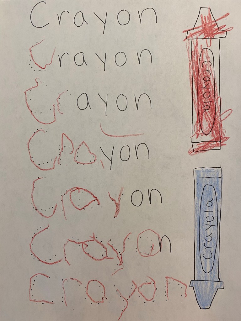 -Crayon name practice: We did this with the word “crayon” but also with my little’s first and last name- you write the word adding another dotted letter each time until they’ve written their whole name or the whole word! My friend Alysha gave me this idea and I thought it was a fun way to practice name writing and go over some letters. And of course I had him write in crayon!