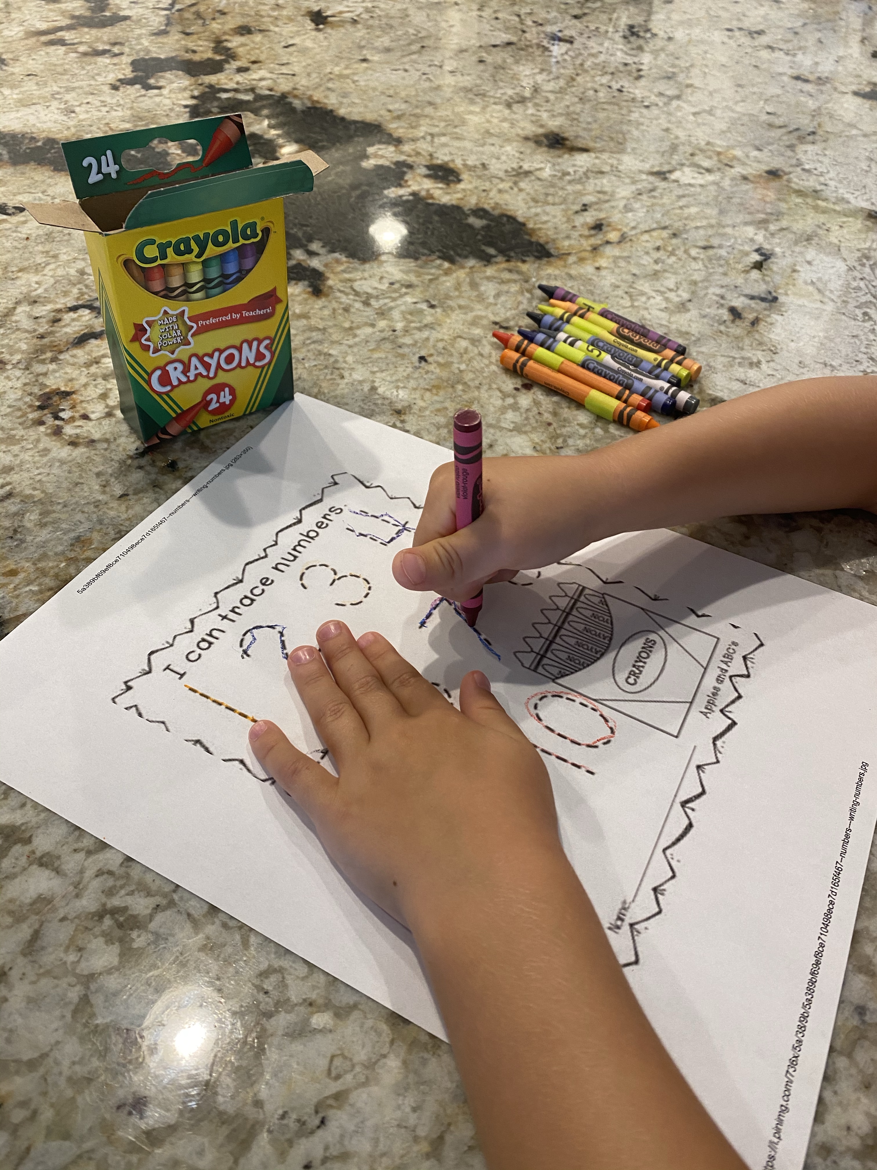 -Crayon number surprise: This was SO fun and actually kept my little engaged through the whole box of crayons! I stuck some washi tape around each crayon then wrote the numbers 1-10 on them- one number per crayon- and popped them back in the box. Then I had my little pull them out one at a time, identify the number, find it on a tracing page, and trace the number with that color! He thought it was really funny that there was more than one crayon for each number! LoL Here’s the tracing page we used, just make sure to print it so it fills the whole page!