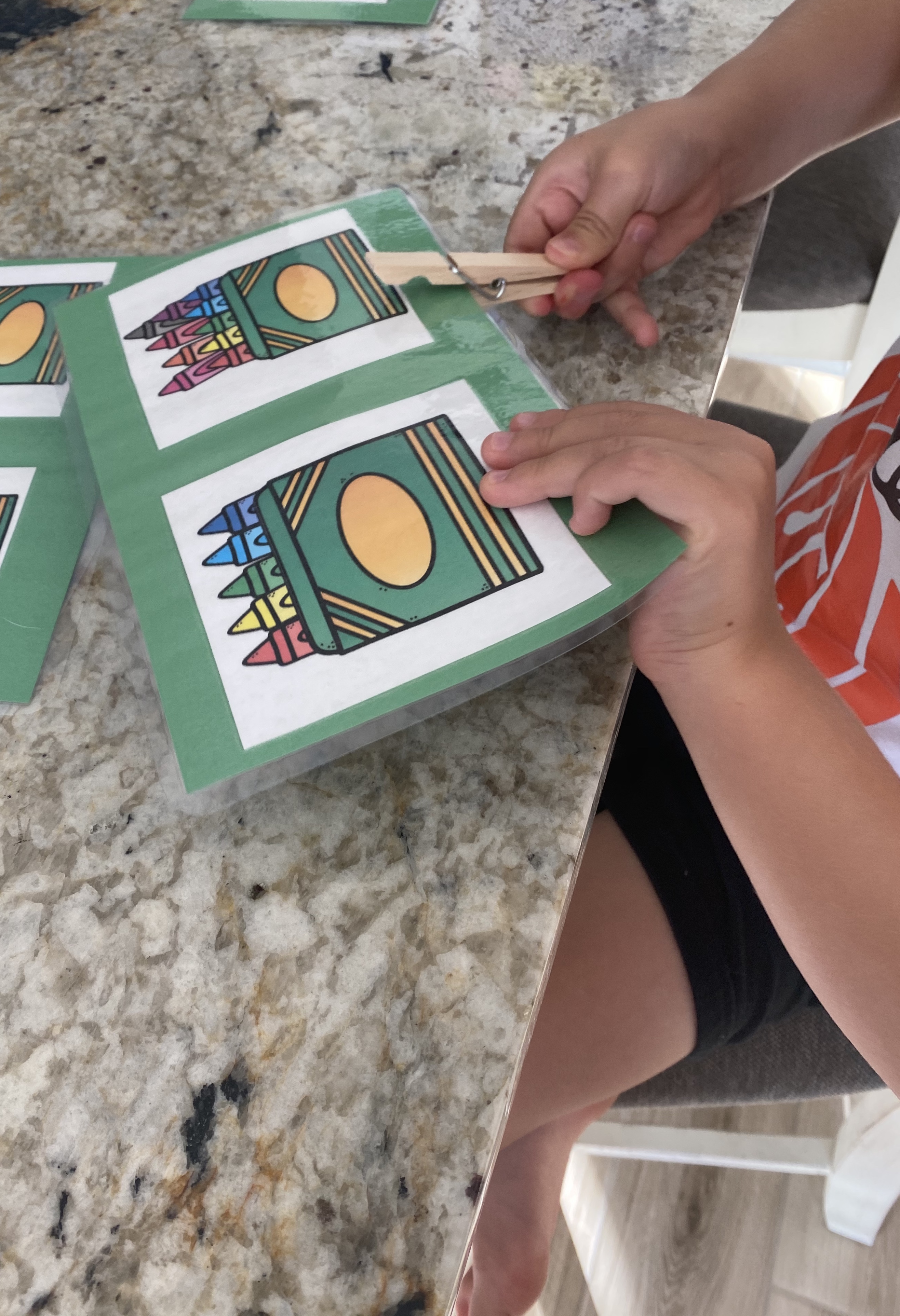 -Crayon roll, write and count: I typed a page up with “roll”, “write” “count” on it, printed a crayon box to stick on the bottom, then laminated it (you could also use a page protector). I had my little roll a 20 sided dice (6 or 10 would work too!), write the number he rolled with a dry erase marker, then put that many crayons in the box by counting them out. I got this idea from Little Over Cs.