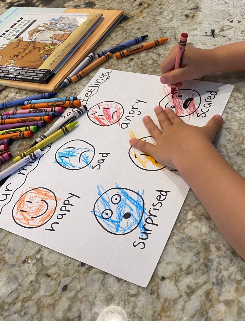 -Our many colored feelings: For this social studies activity we talked about different feelings and how sometimes people think of colors when they’re feeling certain things. I didn’t tell my little what colors to pick, but had him imagine what color he felt for each feeling on the page (which I just drew really quick) and then had him color the face to match. I got this idea from Mosswood Connections.
